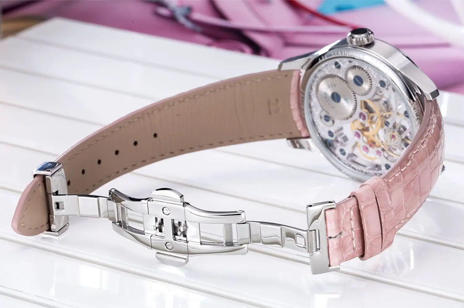Celkový dojem doplňuje růžový řemínek z přírodní kůže s ražbou ve vzoru krokodýlí kůže. Je měkký, pohodlný a dobře se přizpůsobí zápěstí, zatímco motýlková spona přidává na eleganci i praktičnosti. Rezerva chodu činí přibližně 46 hodin, což znamená, že hodinky nezastaví ani v případě, že na ně na chvíli zapomenete.