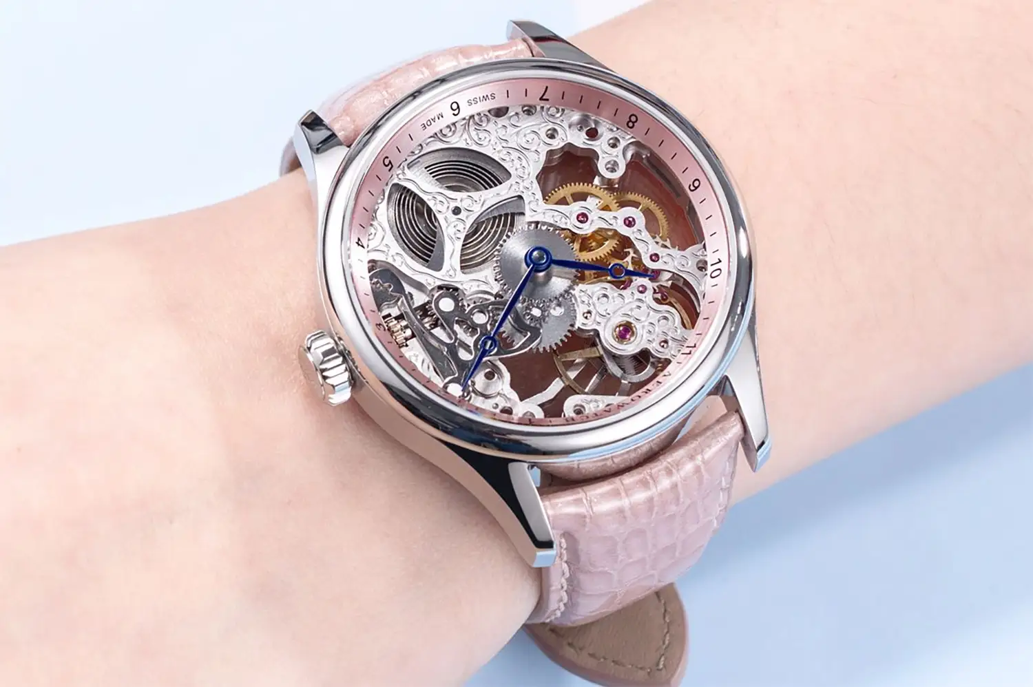 V jejich srdci se nachází ručně natahovaný strojek ETA Unitas 6498-1, který není ukrytý – naopak, byl záměrně odhalen s důrazem na každý detail. Můstky jsou ručně zdobené a otevřený, transparentní ciferník s růžovým minutovým kroužkem umožňuje nerušený pohled na precizní práci švýcarského mechanismu. Tyto hodinky neukazují jen čas – ukazují, jak čas vzniká.