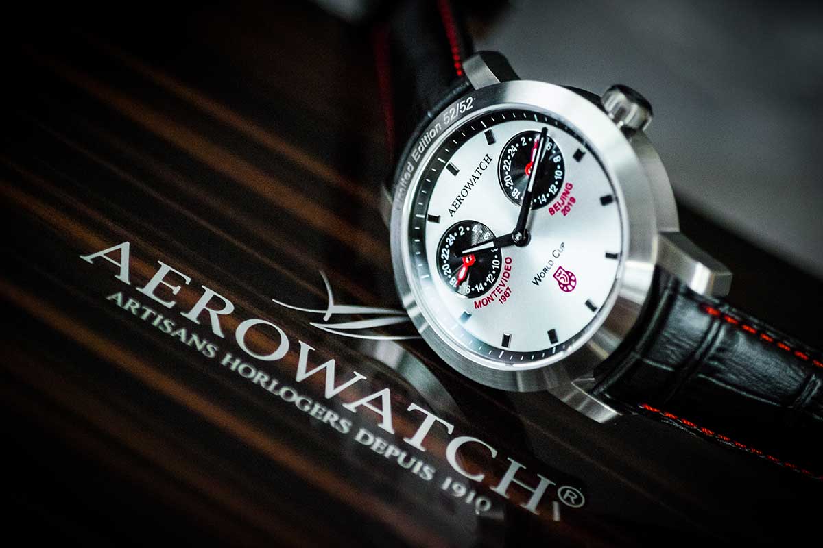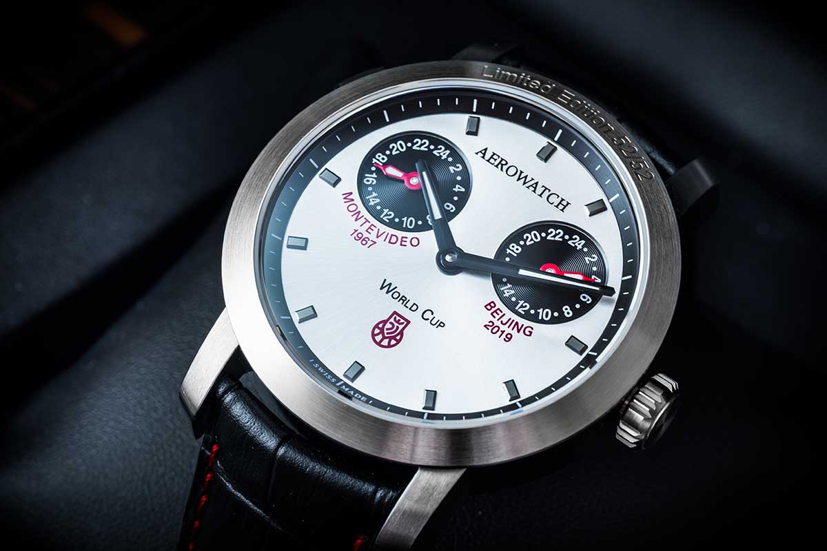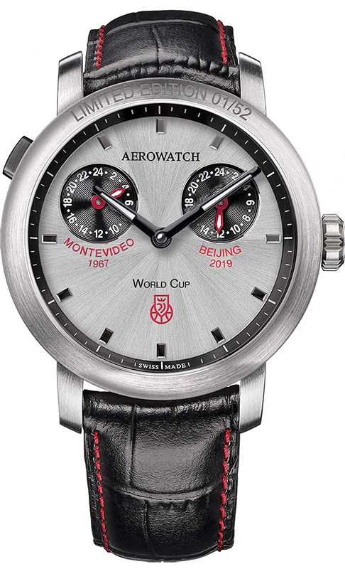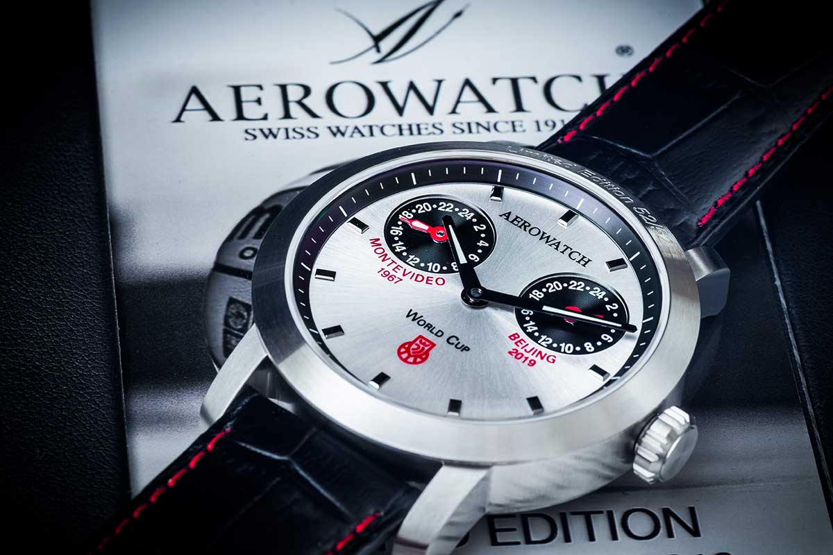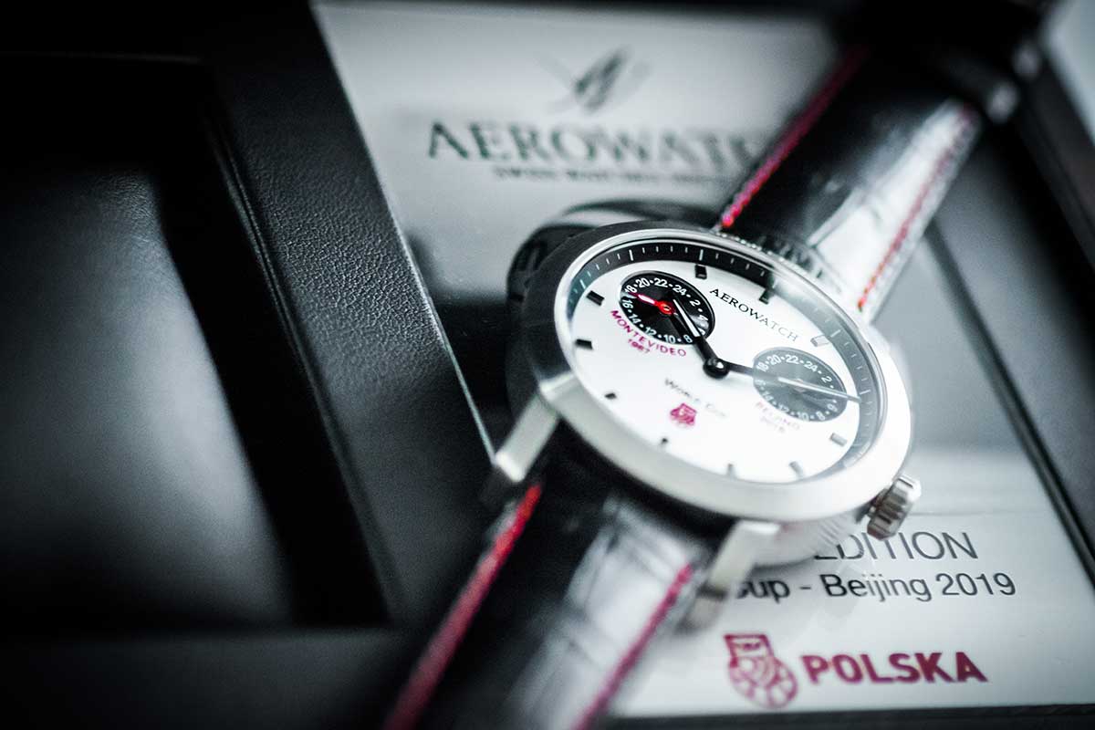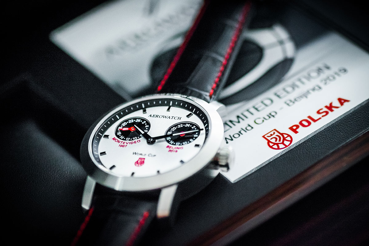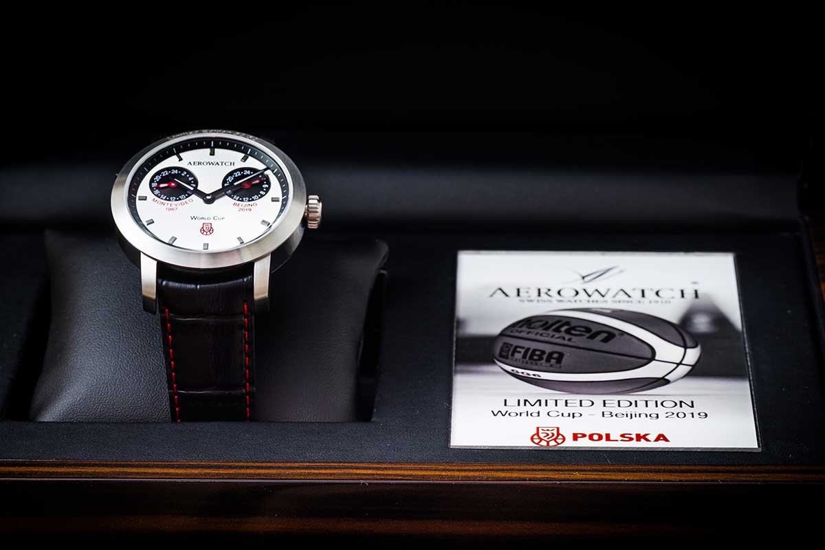Pro tuto mimořádnou příležitost se blíží mistrovství světa v Číně se silnými dopravními zácpami, značka AEROWATCH připravila limitované pánské hodinky - Renaissance Polish Basketball Limited Edition . Vyrobeno bylo pouze 52 kusů a toto číslo není náhodné. Poláci čekali 52 let, až si znovu zahrají na elitním mistrovství světa. Hodinky mají unikátní design, který ukazuje čas ve třech časových pásmech. Kromě hlavního času můžete z ciferníku časomíry odečíst také aktuální čas v Montevideu a Pekingu . K synchronizaci časů slouží speciálně navržené tlačítko umístěné na 10. hodině.Malé, černé ciferníky pro tyto indikace jsou umístěny na 10. a 2. hodině.Výrobce si dal záležet i na detailech. Mají zvláštní, poutavý vzor. Celek dokonale ladí s hlavním ciferníkem ve stříbrné barvě. Vnitřní černý prsten a ručičky dodávají jedinečný charakter a dokonale kontrastují s červenými akcenty. Samozřejmě nemohl chybět logotyp PZK — Polský basketbalový svaz . Nachází se ve spodní části štítu.