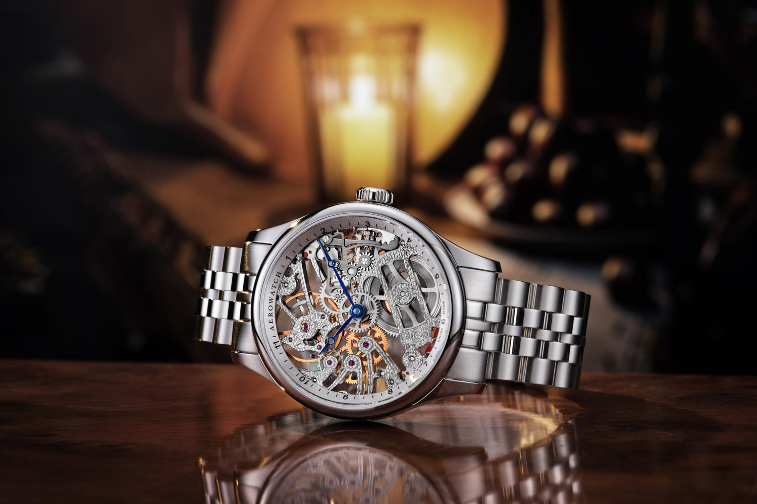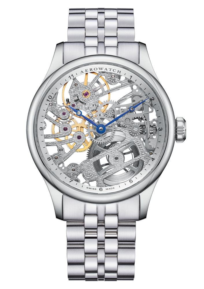 Přední stranu hodinek kryje safírové sklíčko vysoce odolné proti poškrábání. Kryje jedinečný skeletový číselník se stříbrným a saténově upraveným rámečkem s jemnými značkami hodin a hrdým logem Aerowatch. Fenomenální skeletonizace ciferníku umožňuje pozorovat přesné pohyby mechanismu a vytváří tak fascinující vizuální efekt. Čisté linie, vyvážený kontrast a pečlivé zpracování dělají z těchto hodinek opravdové dílo hodinářského umění.