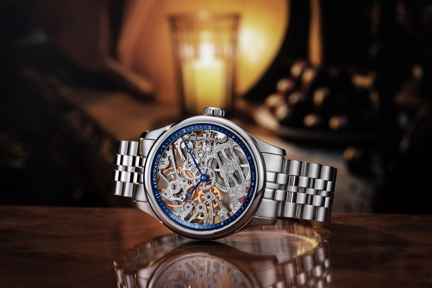 Přední stranu hodinek kryje safírové sklíčko vysoce odolné proti poškrábání. Kryje jedinečný skeletový číselník s modrým saténovým rámečkem s jemnými značkami hodin a hrdým logem Aerowatch. Fenomenální skeletonizace ciferníku umožňuje pozorovat přesné pohyby mechanismu a vytváří tak fascinující vizuální efekt. Čisté linie, vyvážený kontrast a pečlivé zpracování dělají z těchto hodinek opravdové dílo hodinářského umění.