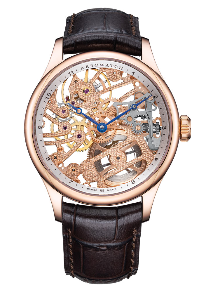 Přední stranu hodinek kryje safírové sklíčko vysoce odolné proti poškrábání. Kryje jedinečný skeletový ciferník s růžovým zlatem a saténovým rámečkem s jemnými značkami hodin a hrdým logem Aerowatch. Fenomenální skeletonizace ciferníku umožňuje pozorovat přesné pohyby mechanismu a vytváří tak fascinující vizuální efekt. Čisté linie, vyvážený kontrast a pečlivé zpracování dělají z těchto hodinek opravdové dílo hodinářského umění.