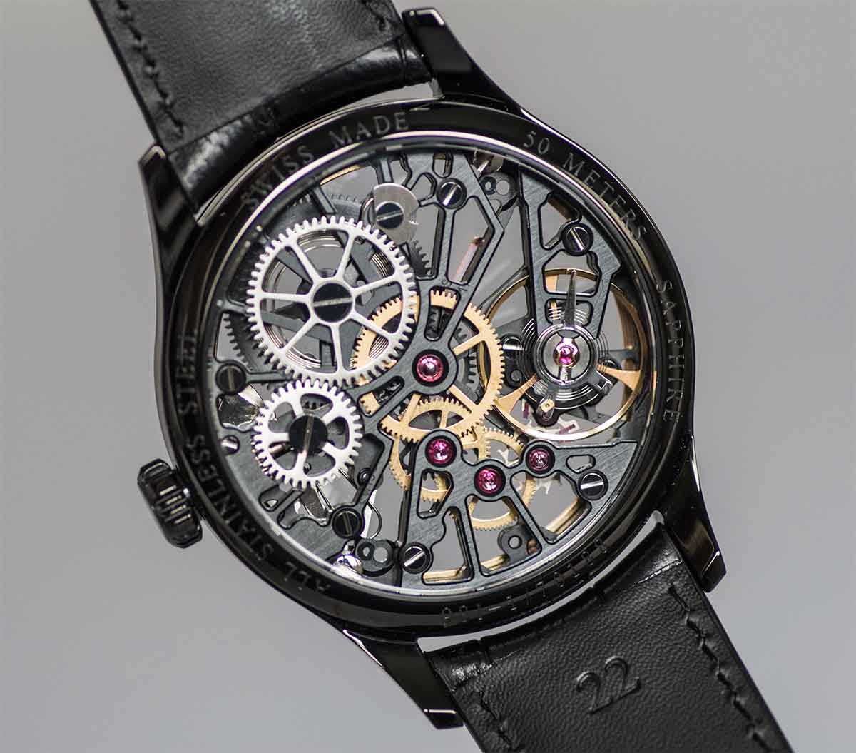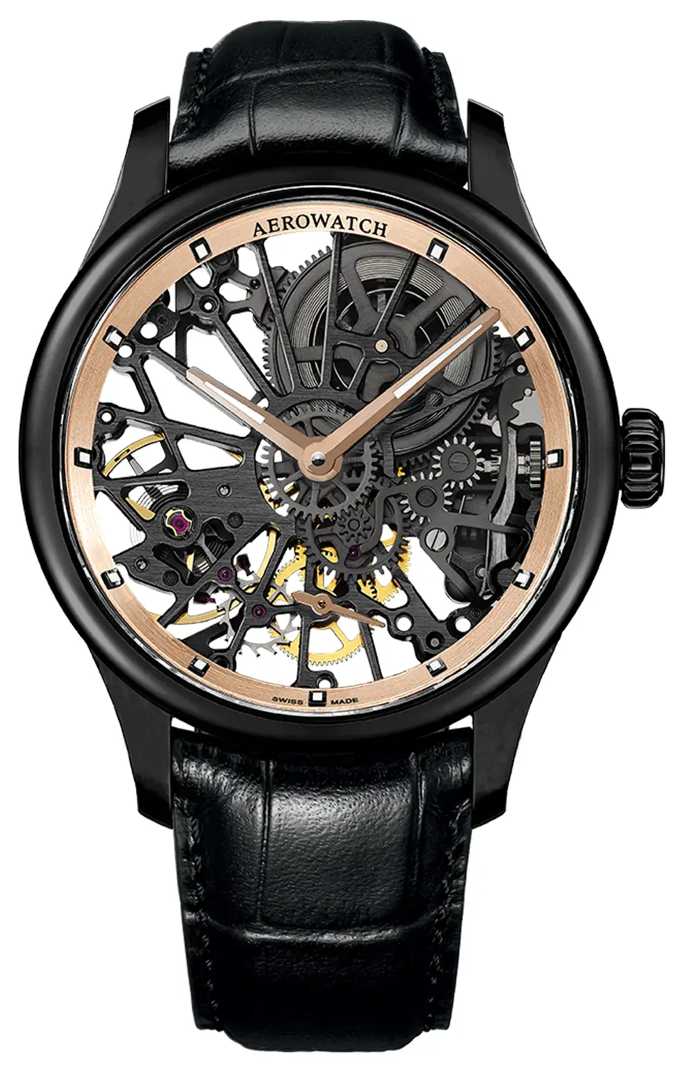 Pánské skeletové hodinky Aerowatch A 50981 NO20 Renaissance Skeleton Cobweb , z kolekce Big Mechanical Skeleton , jsou skutečným dílem hodinářského umění. Propracované, dechberoucí hodinky rozbuší vaše srdce. Ručně vinutý, zdobený Machineek, který vycházel z ETA 6498-1, zdůrazňuje pietismus, řemeslnou zručnost a jedinečnost hodinek. Práci pohybu kostry lze pozorovat přes safírové sklíčko shora a záda skleněné vitríny. Zlacené, silné ručičky s luminiscenční látkou dodávají čitelnost. Pouzdro je vyrobeno z nerezové oceli o průměru 43 mm, potaženo černým PVD povlakem a je kombinováno s vkusným černým páskem s motýlkovou sponou. Ciferník s pozlaceným růžovým zlatem, vnitřní kroužek k celku dokonale ladí. To zdůrazňuje elegantní charakter a odvážný design hodinek. Tento model je rozšířením kolekce skeletových hodinek AEROWATCH. Je určena pro muže, kteří oceňují jedinečné hodnoty švýcarského hodinářství, kteří hledají pozoruhodnou eleganci a vytříbený vzhled.