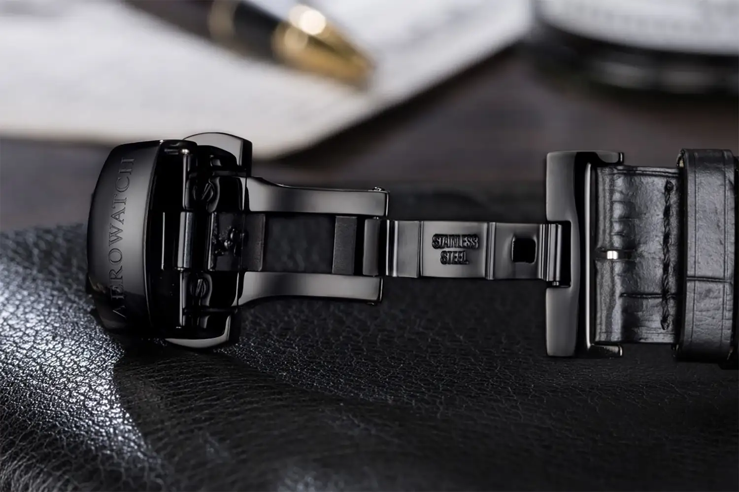 Pouzdro o průměru 43 mm je vyrobeno z ušlechtilé oceli a pokryto černou PVD vrstvou. Jeho matná úprava a leštěné detaily ladí s černým koženým řemínkem s krokodýlím vzorem – bez kontrastního prošívání, pro jednotnou, temnou estetiku. Motýlková spona zajišťuje pohodlí a bezpečnost. Černé ručky s luminiscenční výplní zaručují čitelnost za všech podmínek a vnitřní kroužek – rovněž v černé – dodává celku diskrétní, luxusní akcent.