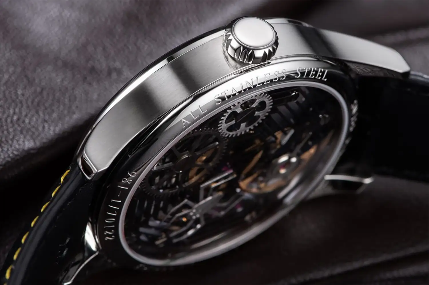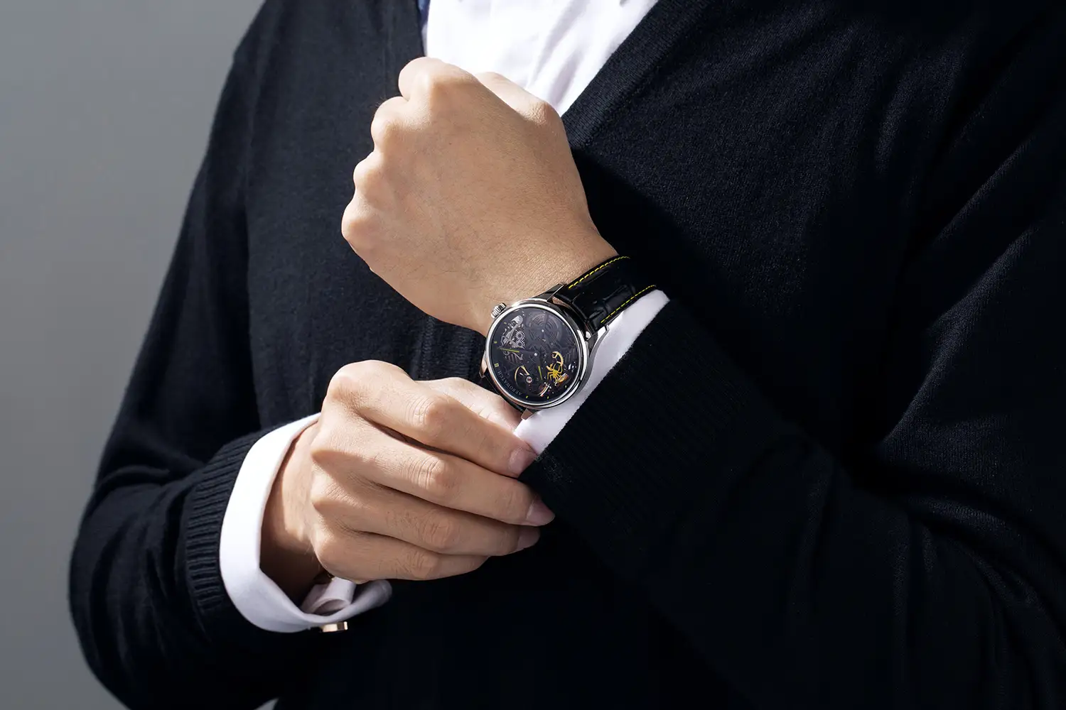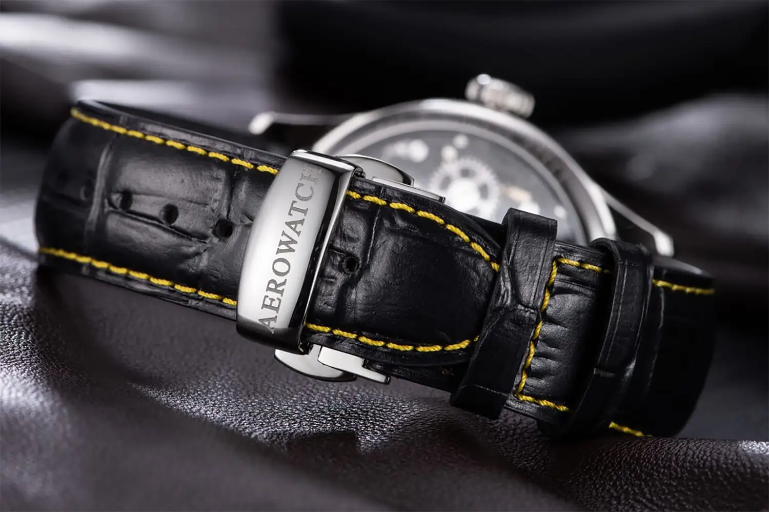 Pouzdro o průměru 43 mm je vyrobeno z matně leštěné ušlechtilé oceli. V kombinaci s kontrastními žlutými akcenty – na kroužku kolem číselníku a prošíváním černého koženého řemínku – vytváří sportovní, a přitom vytříbený charakter. Řemínek s krokodýlím vzorem je vybaven motýlkovou sponou. Černé ručky s luminiscenční výplní zajišťují výbornou čitelnost i za zhoršených světelných podmínek.