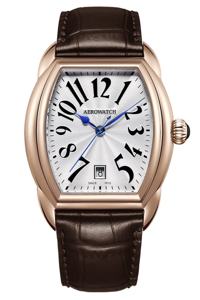 Retro pánské hodinky Aerowatch s referenčním číslem A 42959 RO05 jsou pouzdro na toneau vyrobené z růžové zlaté PVD oceli o velikosti 39 mm x 37,5 mm. Pouzdro tonneau má tvar sudu a určitě vynikne na zápěstí každého muže. Na očka pouzdra je připevněn elegantní hnědý kožený řemínek. Guilloché stříbrný ciferník chrání safírové sklíčko, které se extrémně těžko poškrábe. Ciferník má datumovku na pozici šest hodin. Malé datumové okno nám ukazuje aktuální den v měsíci. Aktuální čas lze odečíst díky elegantním modrým „rýčovým“ ručičkám a arabským číslicím. Na pravé straně pouzdra je velká snadno ovladatelná korunka zdobená tmavým kamenem. O plnou funkčnost a komfort používání se postarala švýcarská značka Aerowatch.