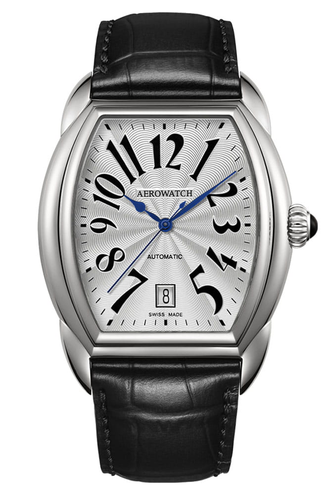 Pánské hodinky Aerowatch v retro stylu s referenčním číslem A 60959 AA06 jsou pouzdro ve tvaru tuny vyrobené z nerezové oceli o velikosti 39 mm x 37,5 mm. Pouzdro na toneau připomíná sud a jistě vynikne na zápěstí každého muže. Na očka pouzdra je připevněn elegantní černý kožený řemínek. Guilloché stříbrný ciferník chrání safírové sklíčko, které se extrémně těžko poškrábe. Ciferník má datumovku na pozici šest hodin. Malé datumové okno nám ukazuje aktuální den v měsíci. Aktuální čas lze odečíst díky elegantním modrým „rýčovým“ ručičkám a arabským číslicím. Na pravé straně pouzdra je velká snadno ovladatelná korunka zdobená tmavým kamenem. O plnou funkčnost a komfort používání se postarala švýcarská značka Aerowatch.