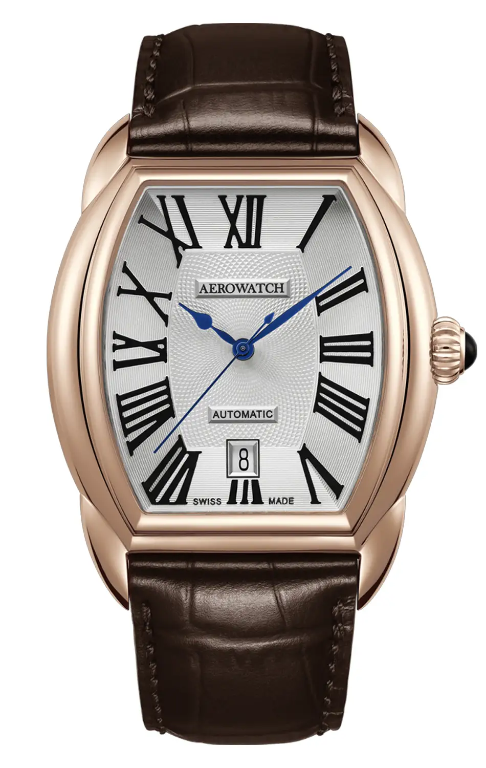 Tento model zaujme elegantním pouzdrem ve tvaru tonneau, které je opatřeno PVD vrstvou v odstínu růžového zlata. Jeho jemný lesk se dokonale doplňuje s gilošovaným číselníkem ve stříbrném odstínu, na němž se vyjímají černé římské číslice a štíhlé ručky typu „spade“ v sytě modré barvě. Pouzdro má rozměry 39 × 37,5 mm a je vyrobeno z ušlechtilé oceli, což zajišťuje odolnost a pohodlné nošení. Safírové sklíčko chrání číselník proti poškrábání a dodává celému designu prestižní charakter.