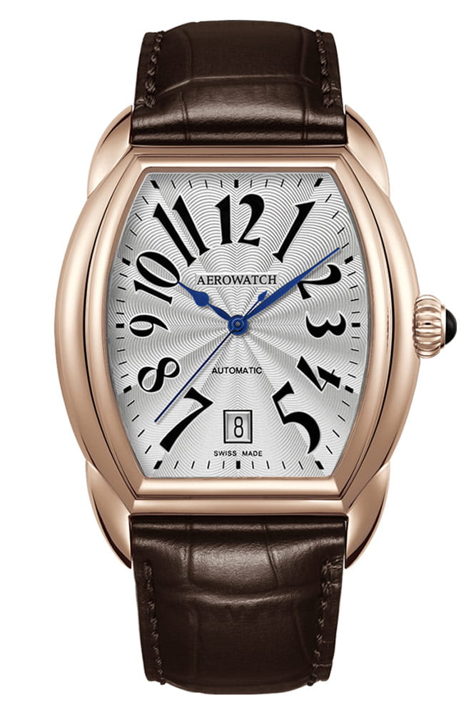 Retro pánské hodinky Aerowatch s referenčním číslem A 60959 RO06 jsou pouzdro pouzdra vyrobené z nerezové oceli, 39 mm x 37,5 mm v barvě růžového zlata PVD. Pouzdro na toneau připomíná sud a jistě vynikne na zápěstí každého muže. Na očka pouzdra je připevněn elegantní hnědý kožený řemínek. Guilloché stříbrný ciferník chrání safírové sklíčko, které se extrémně těžko poškrábe. Ciferník má datumovku na pozici šest hodin. Malé datumové okno nám ukazuje aktuální den v měsíci. Aktuální čas lze odečíst díky elegantním modrým „rýčovým“ ručičkám a arabským číslicím. Na pravé straně pouzdra je velká snadno ovladatelná korunka zdobená tmavým kamenem. O plnou funkčnost a komfort používání se postarala švýcarská značka Aerowatch.