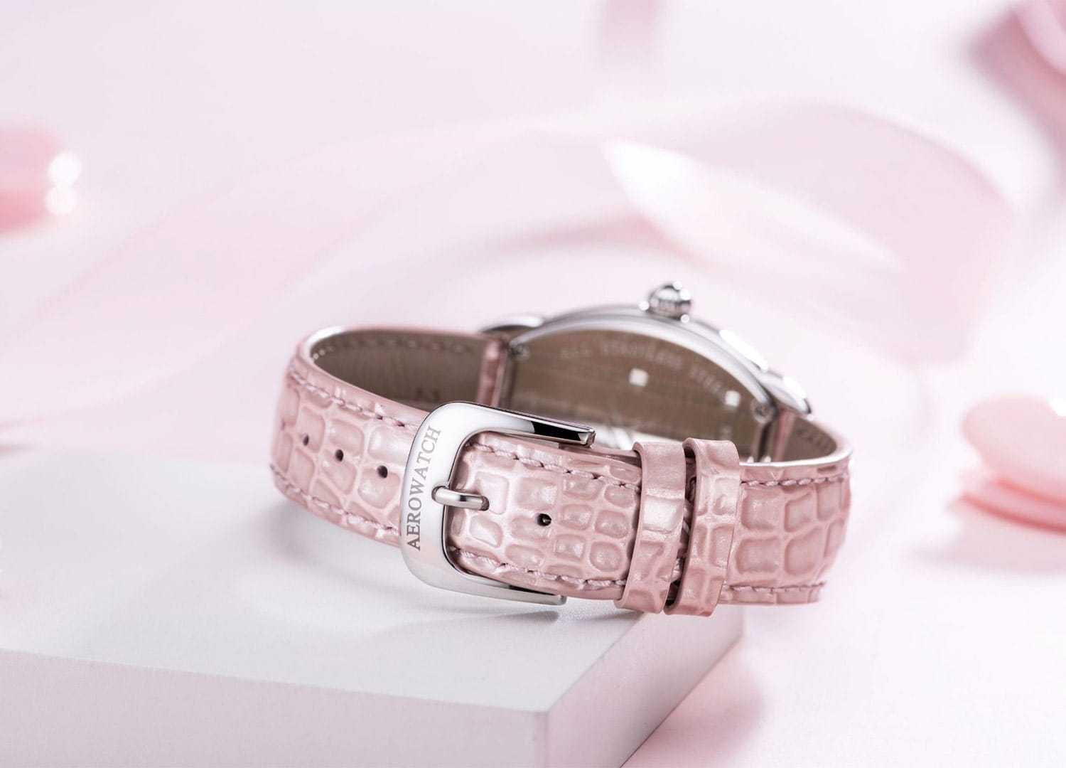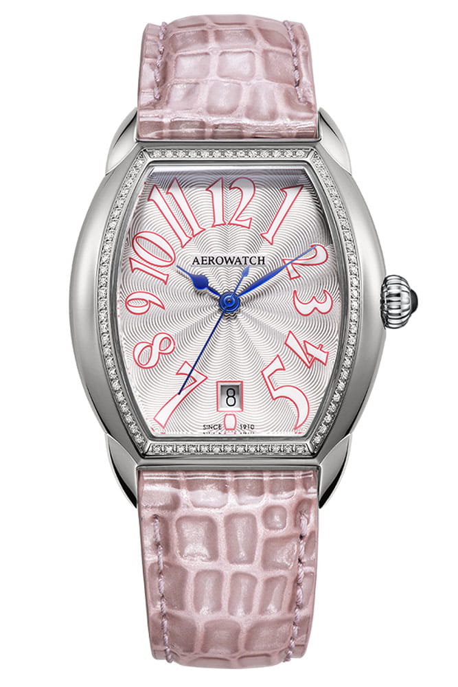 Dámské retro hodinky Aerowatch s referenčním číslem A 42958 AA07 DIA jsou pouzdro ve tvaru tuny z nerezové oceli o rozměru 35 mm x 37 mm. Na přední straně pouzdra je až 78 diamantů 0,30 ct, které hodinky krásně zdobí. Pouzdro tonneau připomíná sud a jistě vynikne na každém ženském zápěstí. Vložené diamanty potěší oko každého majitele této švýcarské časomíry. Na uších pouzdra je připevněn elegantní růžový kožený pásek. Guilloché stříbrný ciferník chrání safírové sklíčko, které se extrémně těžko poškrábe. Ciferník má datumovku na pozici šest hodin. Malé datumové okno nám ukazuje aktuální den v měsíci. Aktuální čas lze číst díky elegantním modrým „rýčovým“ ručičkám a bílým arabským číslicím s růžovým obrysem. Na pravé straně pouzdra je pohodlná korunka zdobená tmavým kamenem. O plnou funkčnost a komfort používání se postarala švýcarská značka Aerowatch.