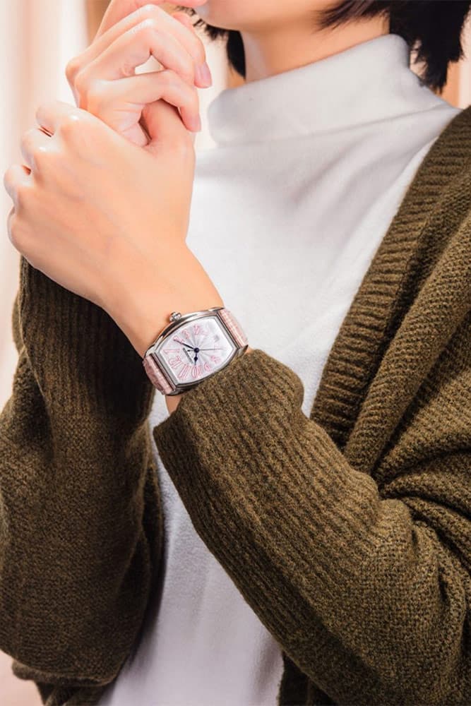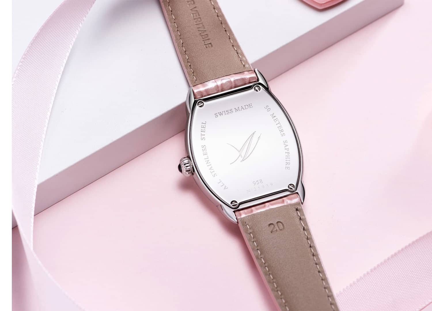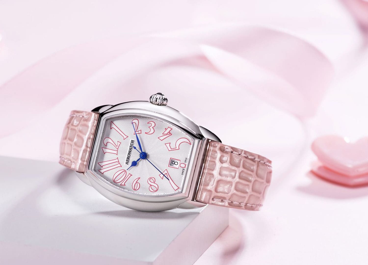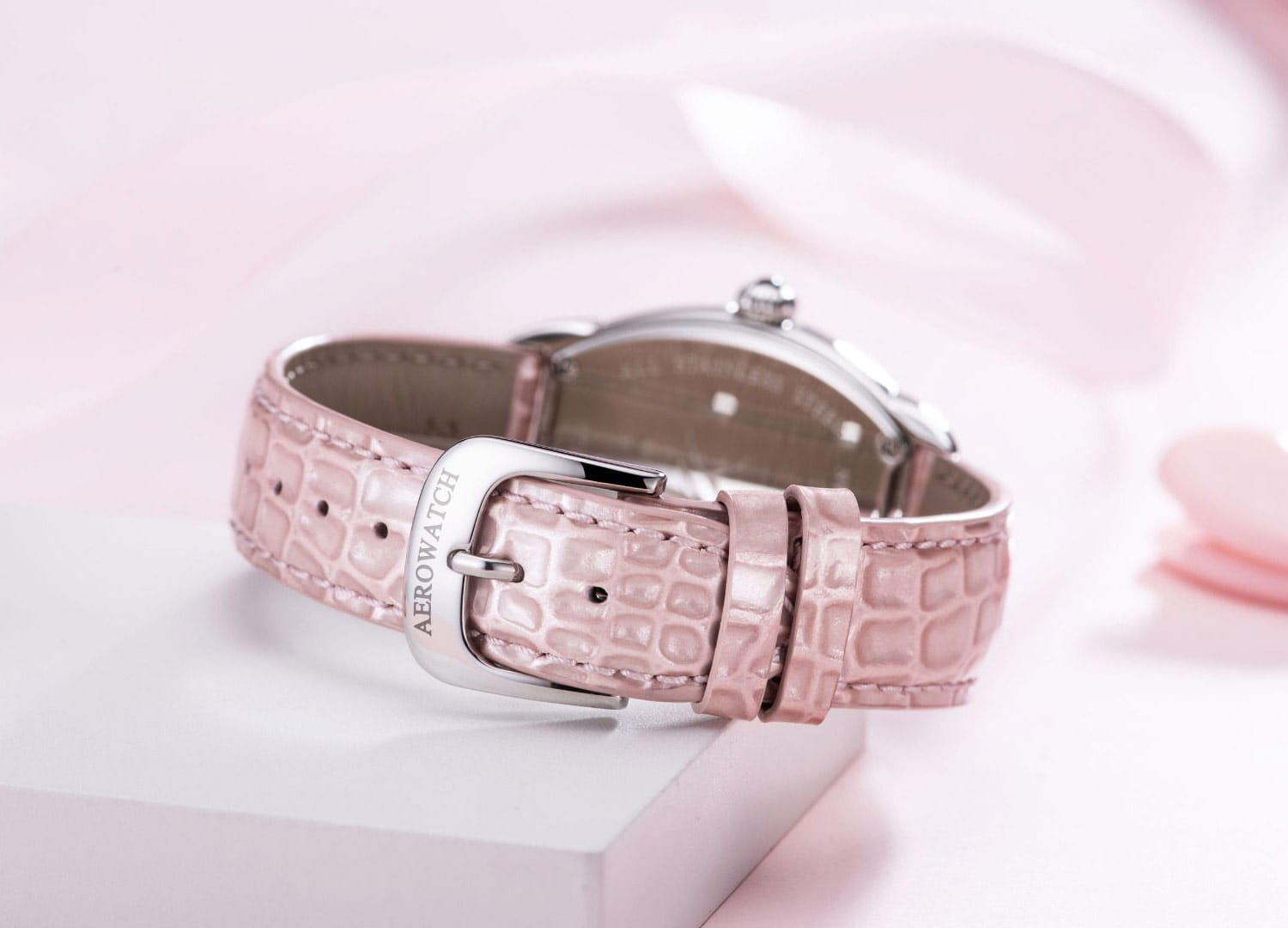 Dámské hodinky v retro stylu Aerowatch s referenčním číslem A 42958 AA07 jsou pouzdro na toneau vyrobené z nerezové oceli o velikosti 35 mm x 37 mm. Pouzdro tonneau připomíná sud a jistě vynikne na každém ženském zápěstí. Na uších pouzdra je připevněn elegantní růžový kožený pásek. Guilloché stříbrný ciferník chrání safírové sklíčko, které se extrémně těžko poškrábe. Ciferník má datumovku na pozici šest hodin. Malé datumové okno nám ukazuje aktuální den v měsíci. Aktuální čas lze číst díky elegantním modrým „rýčovým“ ručičkám a bílým arabským číslicím s růžovým obrysem. Na pravé straně pouzdra je pohodlná korunka zdobená tmavým kamenem. O plnou funkčnost a komfort používání se postarala švýcarská značka Aerowatch.