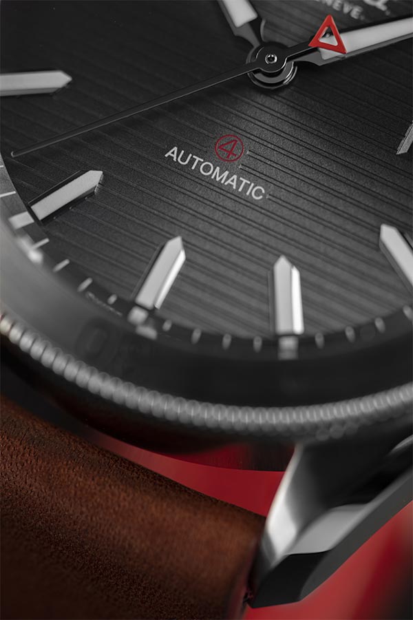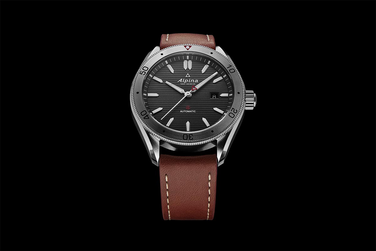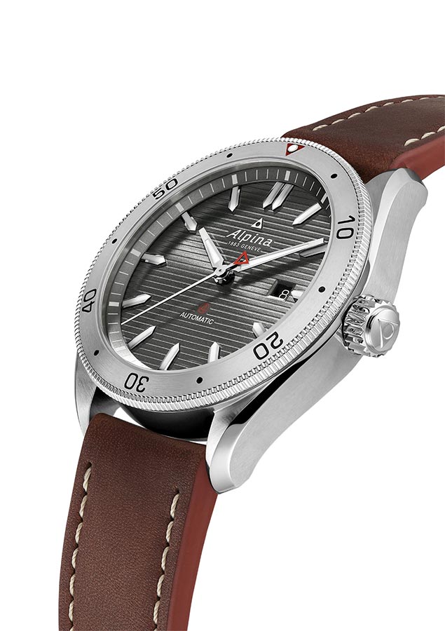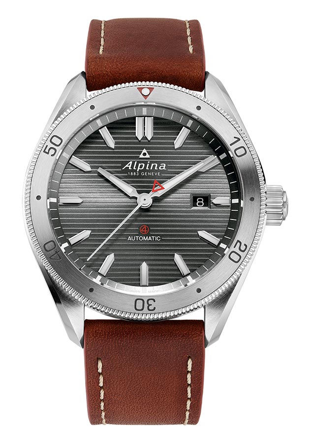 Poprvé v historii kolekce se Alpiner 4 objevuje v šedém ciferníku zdobeném horizontálními linkami a leštěným povrchem, který přináší veškeré světlo do indexů, korunky a data pro perfektní čitelnost. Ciferník tak získává třetí rozměr, přesahující rámečky rovného povrchu. Neobvyklé pozadí dynamicky zvýrazňuje červená protiváha sekundové ručičky, která v podobě trojúhelníku symbolizuje alpské štíty, mezi nimiž byla Alpina postavena. Nakonec byly indexy a hodinové a minutové ručičky vyplněny švýcarskou bílou luminiscenční hmotou, díky které jsou hodiny čitelné po setmění a v případě potřeby i 100 metrů pod vodou.