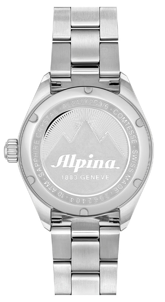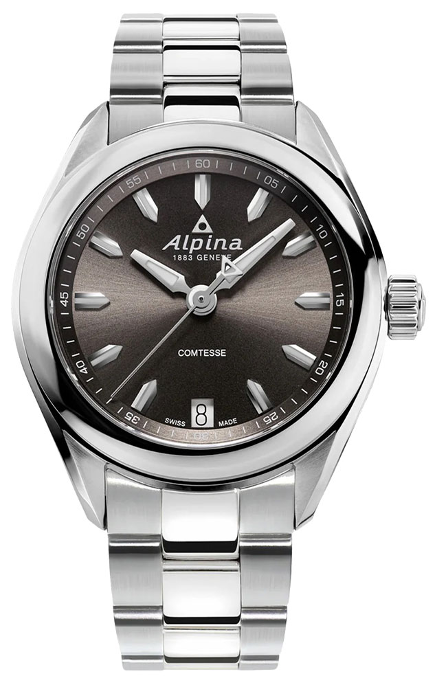 Bytost ALPINA jedna z nejstarších společností v segmentu hodinářství představuje model, který je přesným odrazem ženskosti. Zobrazuje hodinky s nejbohatším obsahem uprostřed. Poutavý šedý ciferník zdobí 11 zaostřených indexů. Mezi další prvky patří sportovní ručičky a datumové okénko na pozici šesté hodiny. Ručně aplikované stříbřité indikace byly navíc obohaceny o luminiscenční látku, která ve tmě indikace osvětluje. Celý je chráněn extrémně odolným proti poškrábání a křišťálově čistým safírovým sklem. Leštěné matné pouzdro o průměru 34mm a krásný náramek z nerezové oceli se vyznačuje vysokou odolností proti korozi.