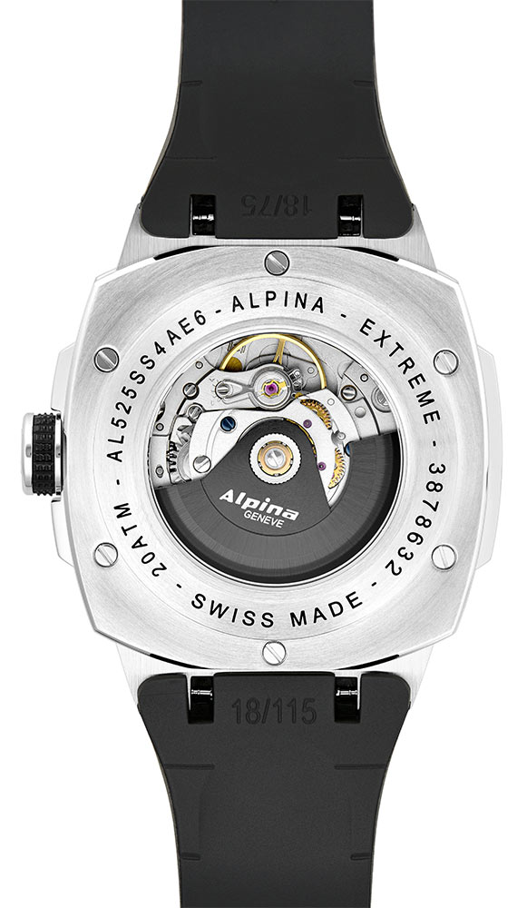 Tyto hodinky byly vyvinuty s ohledem na dobrodružství, které je jednou z hlavních vášní Alpiny, a znovu potvrzují svého Originního ducha. Díky svému nekompromisnímu vzhledu zajišťuje maximální čitelnost i schopnost přežít extrémní podmínky. Operativní hodinky Alpina mají neodmyslitelnou identitu díky integrovanému gumovému pásku, lunetě s trojúhelníkovými šrouby a pouzdru z nerezové oceli v tzv. tvar polštáře. Zařazením do řad Alpiner kolekce Extreme Automatic postupně potvrzuje své povolání objevovat přírodu. Dnes Alpina představuje novou verzi, která se s touto výzvou vypořádává dvěma způsoby: zachovává ducha dobyvatelství Extreme Automatic s asertivnějším stylem a novou velikostí 41 x 42,5 mm, díky čemuž je ideální pro každodenní použití. Tyto změny jsou výsledkem reakce na měnící se životní styl uživatelů. S kompaktními a nesporně odolnými automatickými hodinkami Alpina AL-525B4AE6 lze pracovat ve městě i do hor a provozovat vzrušující extrémní sporty.