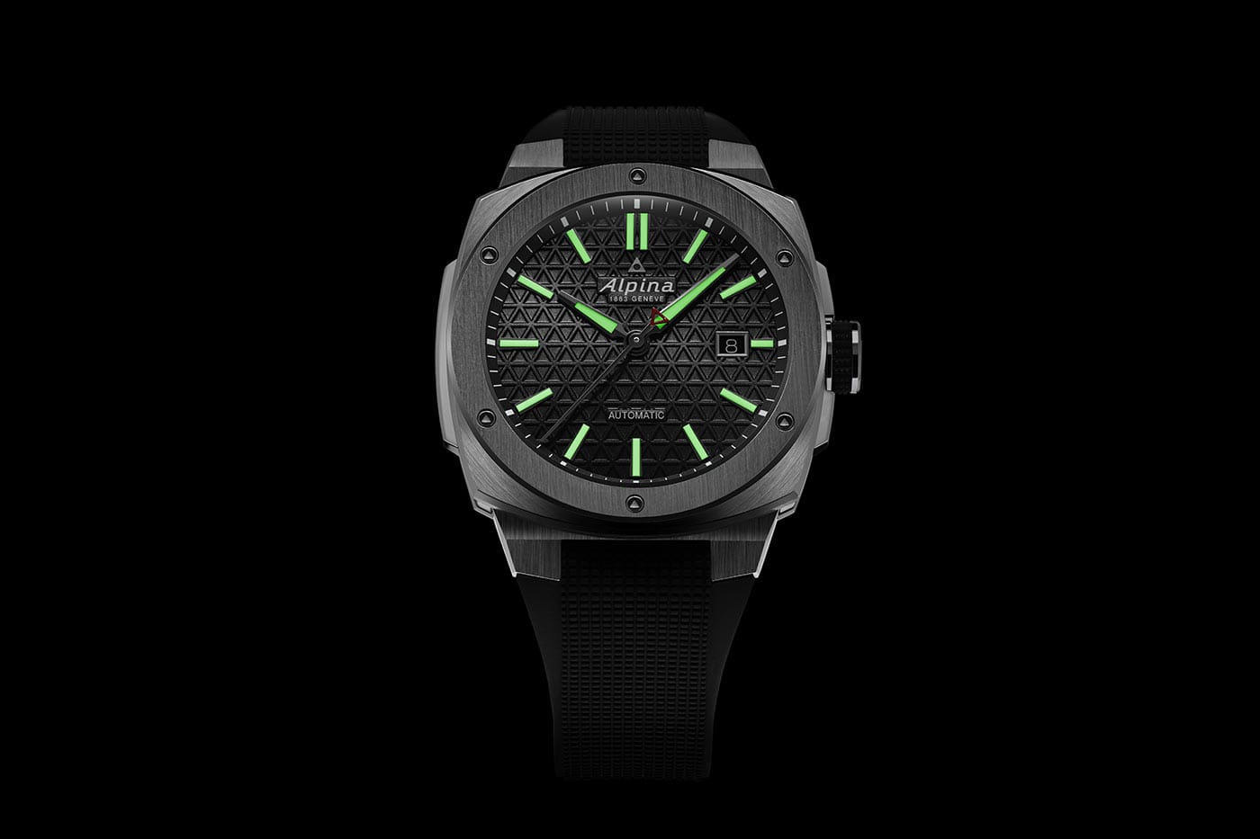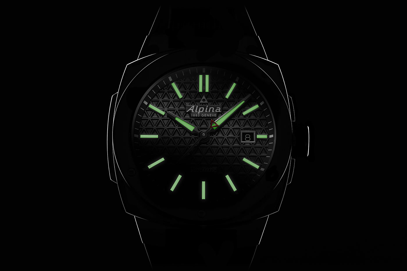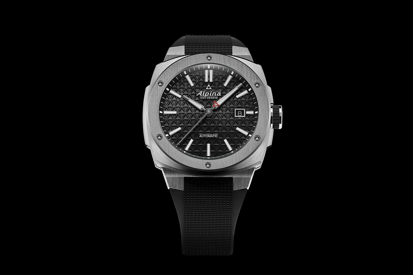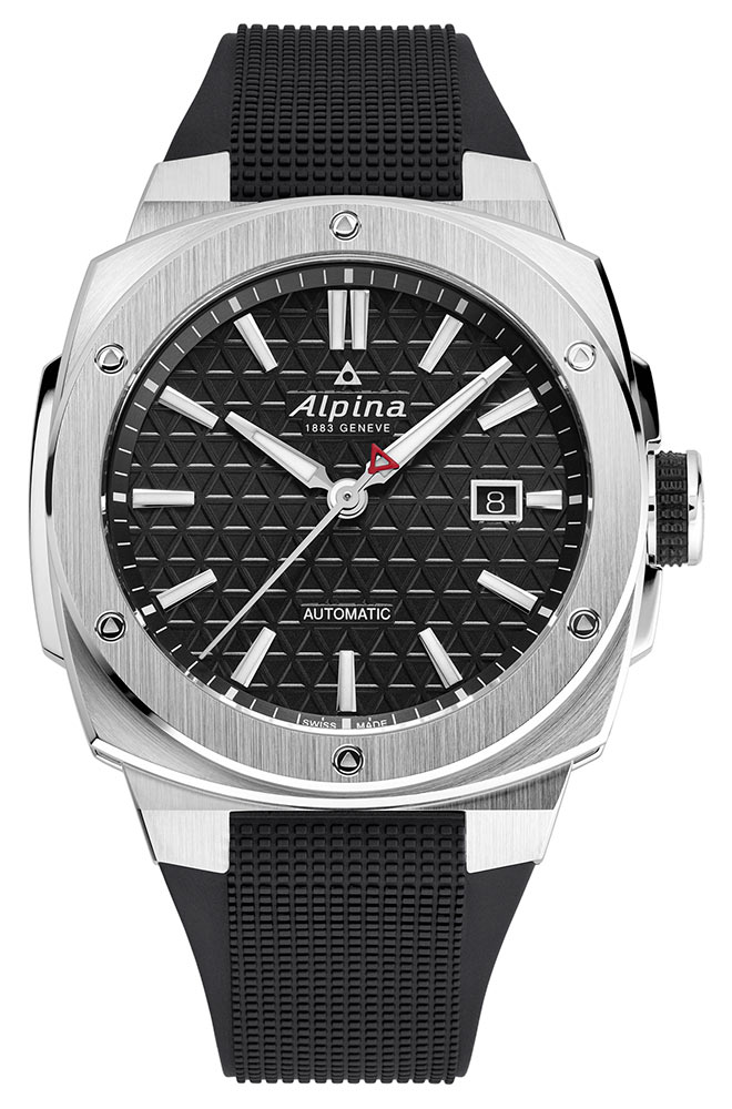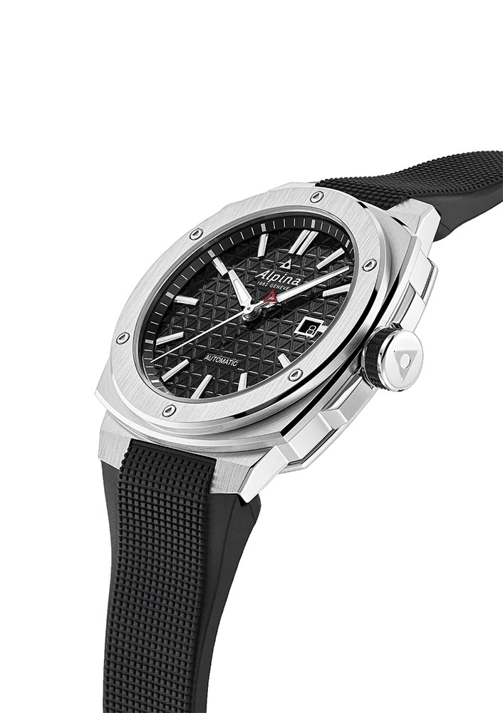 Kolem rámečku pouzdra je šest trojúhelníkových šroubů s odkazem na logo Alpina a estetickou postavu nezměněnou od roku 2009. Integrovaný řemínek (bez konektoru k pouzdru) je vyroben z texturované pryže – známá vlastnost, ale přezkoumaná, aby poskytovala tolik pohodlí, jako je pevná a moderní. Na různých místech pevného pouzdra je středová výztuha (na 9. hodině) a kryt korunky (na 3. hodině). Korunka má stále gumovou rukojeť, kterou oceníme pro její účinnost při snadném ovládání holýma rukama nebo v rukavicích. Korunka i zadní strana pouzdra jsou přišroubované, aby byla zajištěna vodotěsnost do 20 ATM/200 metrů.