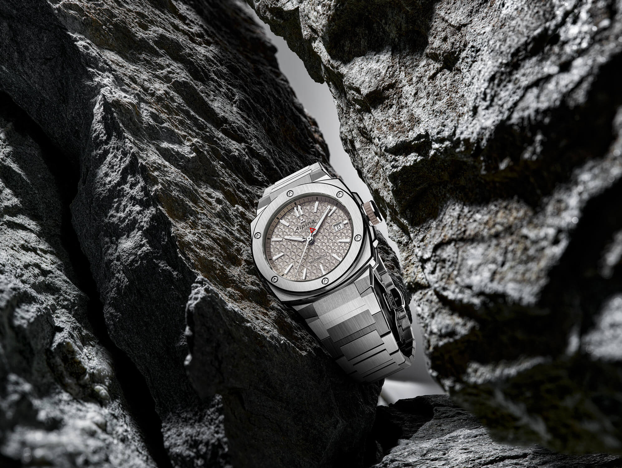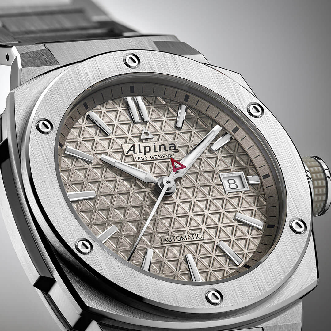 Tento model odráží filozofii značky Alpina, která již více než sto let čerpá inspiraci z přírody a klade důraz na spolehlivost v extrémních podmínkách. Každý detail hodinek byl pečlivě navržen tak, aby zajistil maximální odolnost a čitelnost. Pouzdro se vyznačuje šesti trojúhelníkovými šrouby na rámečku, které odkazují na logo značky, a integrovaným ocelovým náramkem, který zajišťuje nejen vysoký komfort nošení, ale také trvanlivost. Chráněno šroubovací korunkou s gumovým povrchem pro snadnou manipulaci za jakýchkoliv podmínek, konstrukce hodinek garantuje vodotěsnost až do 200 metrů (20 ATM), což je činí ideálním společníkem pro vodní sporty a aktivity na čerstvém vzduchu. Robustnost této konstrukce jde ruku v ruce s estetikou – lesklá textura číselníku a precizně profilované prvky odrážejí vysokou kvalitu zpracování.