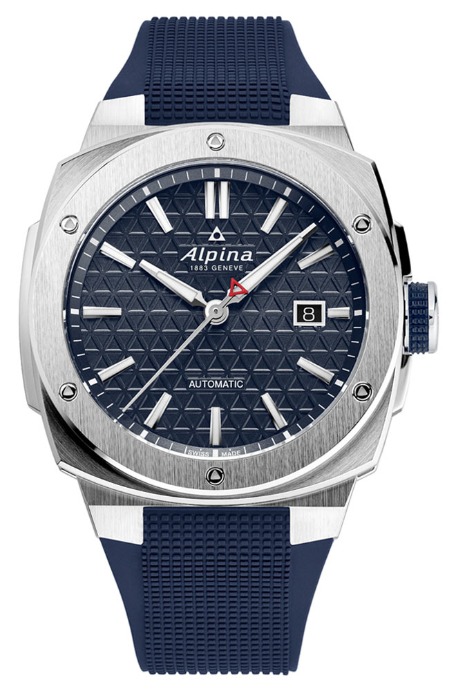 Kolem rámečku pouzdra je šest trojúhelníkových šroubů s odkazem na logo Alpina a estetickou postavu nezměněnou od roku 2009. Integrovaný řemínek (bez konektoru k pouzdru) je vyroben z texturované pryže – známá vlastnost, ale přezkoumaná, aby poskytovala tolik pohodlí, jako je pevná a moderní. Na různých místech pevného pouzdra je středová výztuha (na 9. hodině) a kryt korunky (na 3. hodině). Korunka má stále gumovou rukojeť, kterou oceníme pro její účinnost při snadném ovládání holýma rukama nebo v rukavicích. Korunka i zadní strana pouzdra jsou přišroubované, aby byla zajištěna vodotěsnost do 20 ATM/200 metrů.