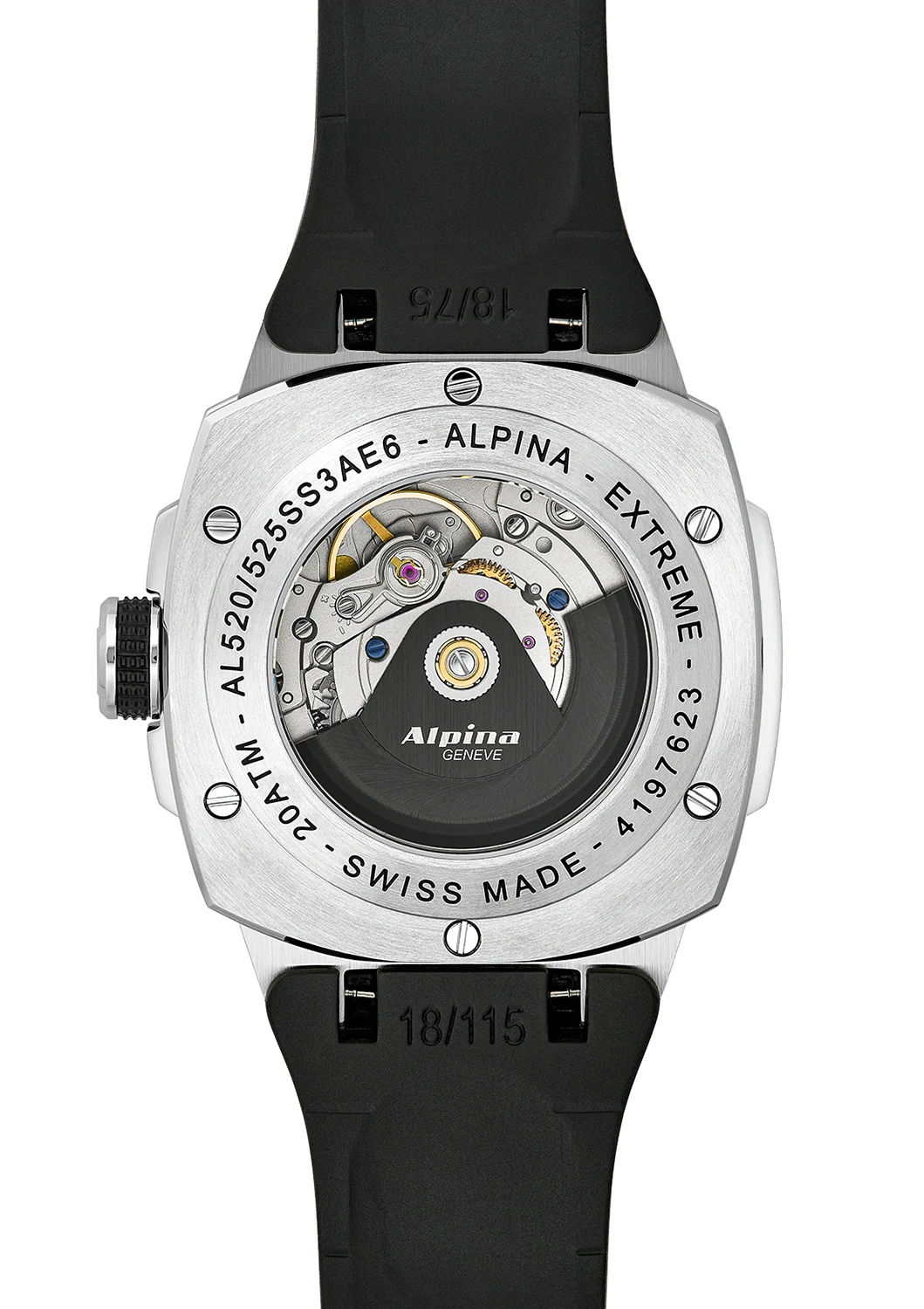 Srdcem modelu je kalibr AL-525 (základ SW200) s rezervou 38 h, známý rovnoměrným, předvídatelným během a komfortním servisem. Pohyb rotoru lze obdivovat přes průhledné dýnko; kontrastní černý rotor dodává technický šmrnc. Konstrukci uzavírá přišroubované dýnko, které zpevňuje schránku a pomáhá udržet WR 20 ATM – úroveň umožňující volně plavat a věnovat se vodním sportům.