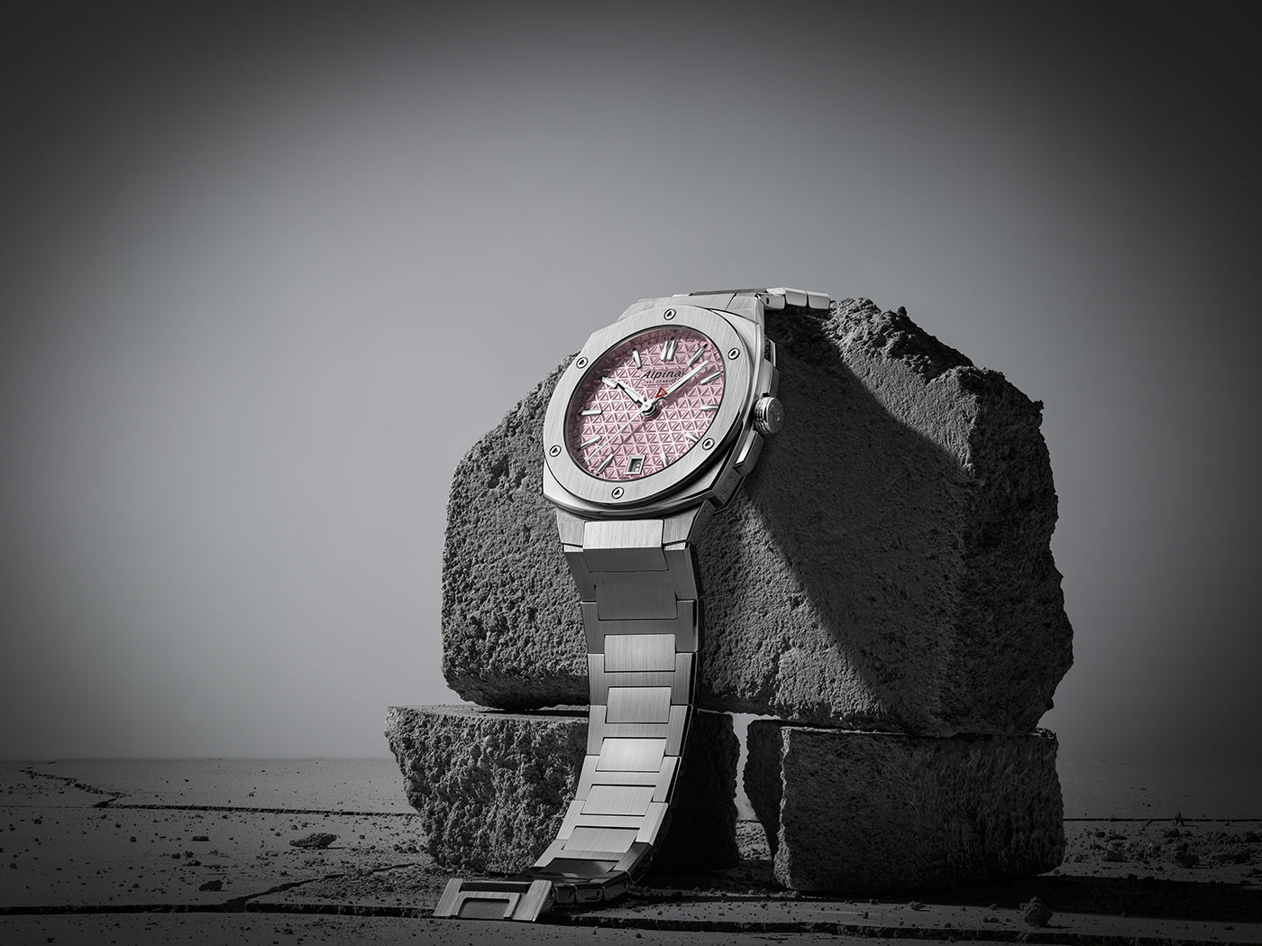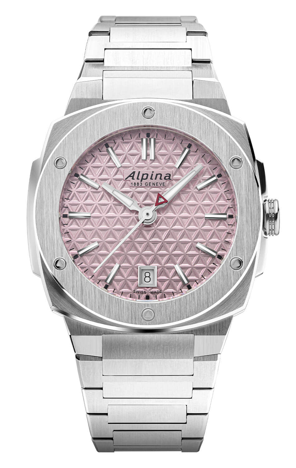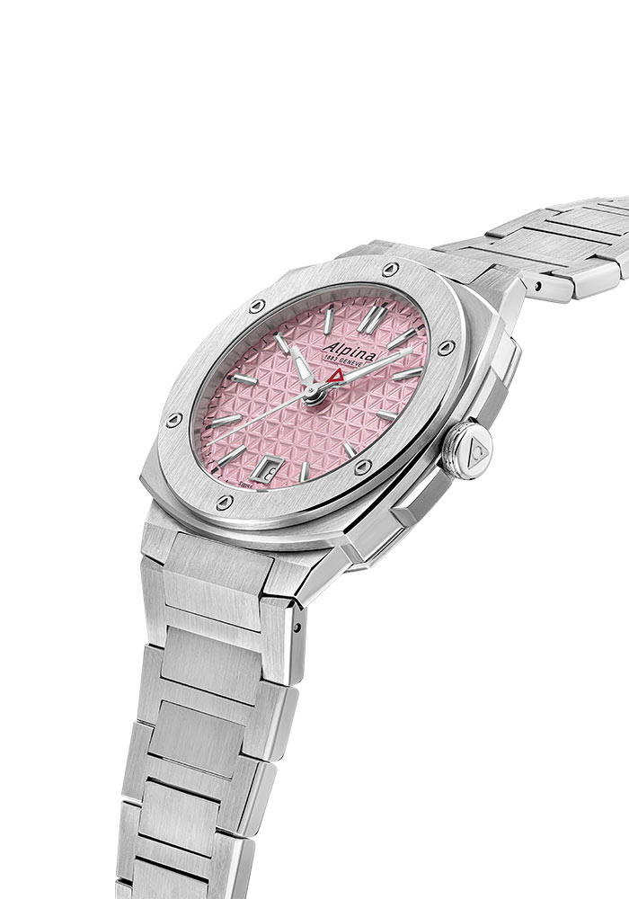 Dámské hodinky Alpina Alpiner Extreme Quartz AL-220PI2AE6B jsou kompaktním sportovním modelem s odolnou skříní typu Extreme o menších rozměrech než její předchůdce - 34 × 35,2 mm. Ciferník v odstínu lesklé růže odráží světla svítání prolínající se přes horské štíty, a vyrytý trojúhelníkový emblém Alpina dodává hodinkám jejich jedinečný charakter. Navíc, nad ním dohlíží nejlepší ve své třídě odolné safírové sklo s antireflexní vrstvou, které je odolné proti poškrábání.