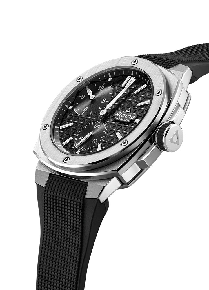 Alpiner Extreme Regulator Automatic je vybaven ciferníkem, který si zachoval svou DNA neporušenou tím, že představuje exkluzivní vzor trojúhelníků, symbolizujících alpské vrcholy, který se táhne po celém povrchu ciferníku. Překrývající se trojúhelníky zachycují sluneční paprsky, které vrhají specifické světlo na ciferník, čímž se jejich odlesky mísí a dodávají mu život. Vyrobeno v černé barvě, odrážející hory, ze kterých Alpina pochází. Tuto černou barvu najdete také na minutovém kroužku, pryžovém držáku korunky a pryžovém řemínku.