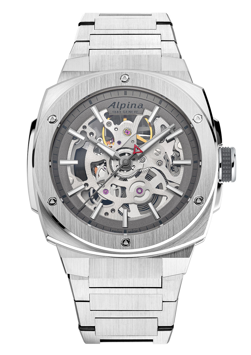 Obojek, minutová stupnice a šroubovací držák korunky, navržené pro komfortní použití i v náročných podmínkách, jsou pokryty různými odstíny šedé a vytvářejí stylový technický vzhled. Hodinové značky jsou ručně aplikované a na novém skeletonizovaném modelu se zdá, že se vznášejí nad číselníkem a vytvářejí pocit hloubky. Dokončení tří centrálních rukou bylo také provedeno ručně. Svítící hodinová a minutová ručka zajišťují vynikající čitelnost, zatímco červený trojúhelníkový hrot sekundovky, typický pro značku Alpina, dodává výrazný akcent. Stejný trojúhelníkový motiv najdeme i v šesti šroubech na lunetě, jejichž hlavičky decentně odkazují na logo Alpina. Automatické hodinky Alpina s odkrytým mechanismem pohání švýcarský strojek Sellita SW200. Jeho přesnost, pevné komponenty a rezerva chodu až 38 hodin svého majitele nezklame.