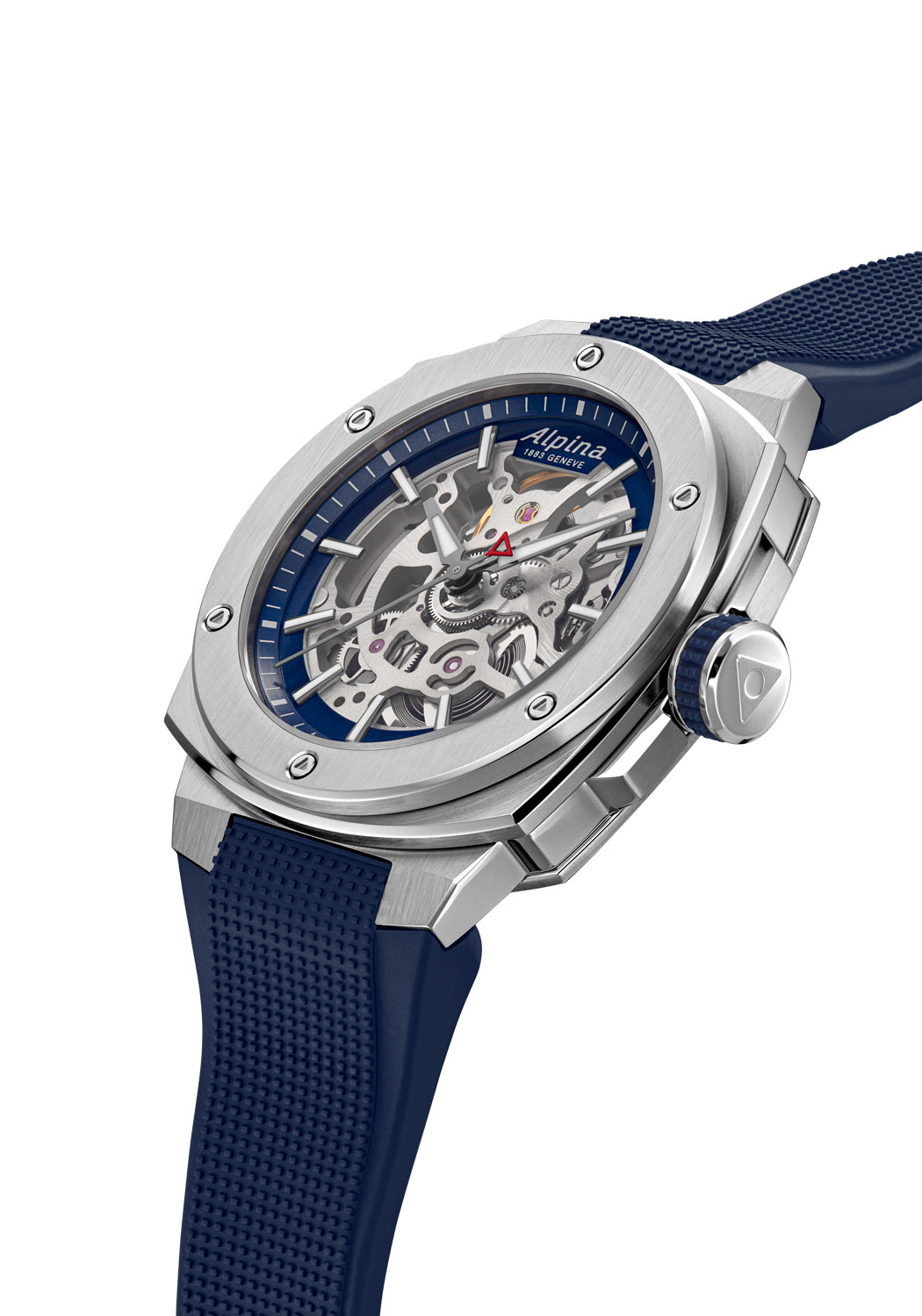Kolekce Alpiner Extreme Automatic byla poprvé v historii obohacena o skeletonový model, s menším pouzdrem o průměru 40.40 mm. Tento design je založen na harmonické kombinaci charakteristického pouzdra na polštář, vytvořeného s ohledem na průzkumníky, a přesného švýcarského automatického strojku, který jej pohání. Dynamické ostré linie masivního pláště jsou zjemněny jemnými křivkami pružinové hlavně, složitým uspořádáním ozubených kol a rafinovaně posunutým únikem, patrným na pozici dvanácti hodin. S ohledem na estetiku byl kalibr záměrně skeletonizován v oblasti mezi 8. hodinou a 1. hodinou, což umožňuje pronikání světla do nitra strojku a tento efekt umocňuje díky průhlednému safírovému zadnímu pouzdru. Hodinky Alpina Skeleton Automatic budou perfektní volbou pro vodní aktivity. Třída těsnosti 200 metrů vám umožňuje volně plavat a potápět se, aniž byste hodinky sundávali.
