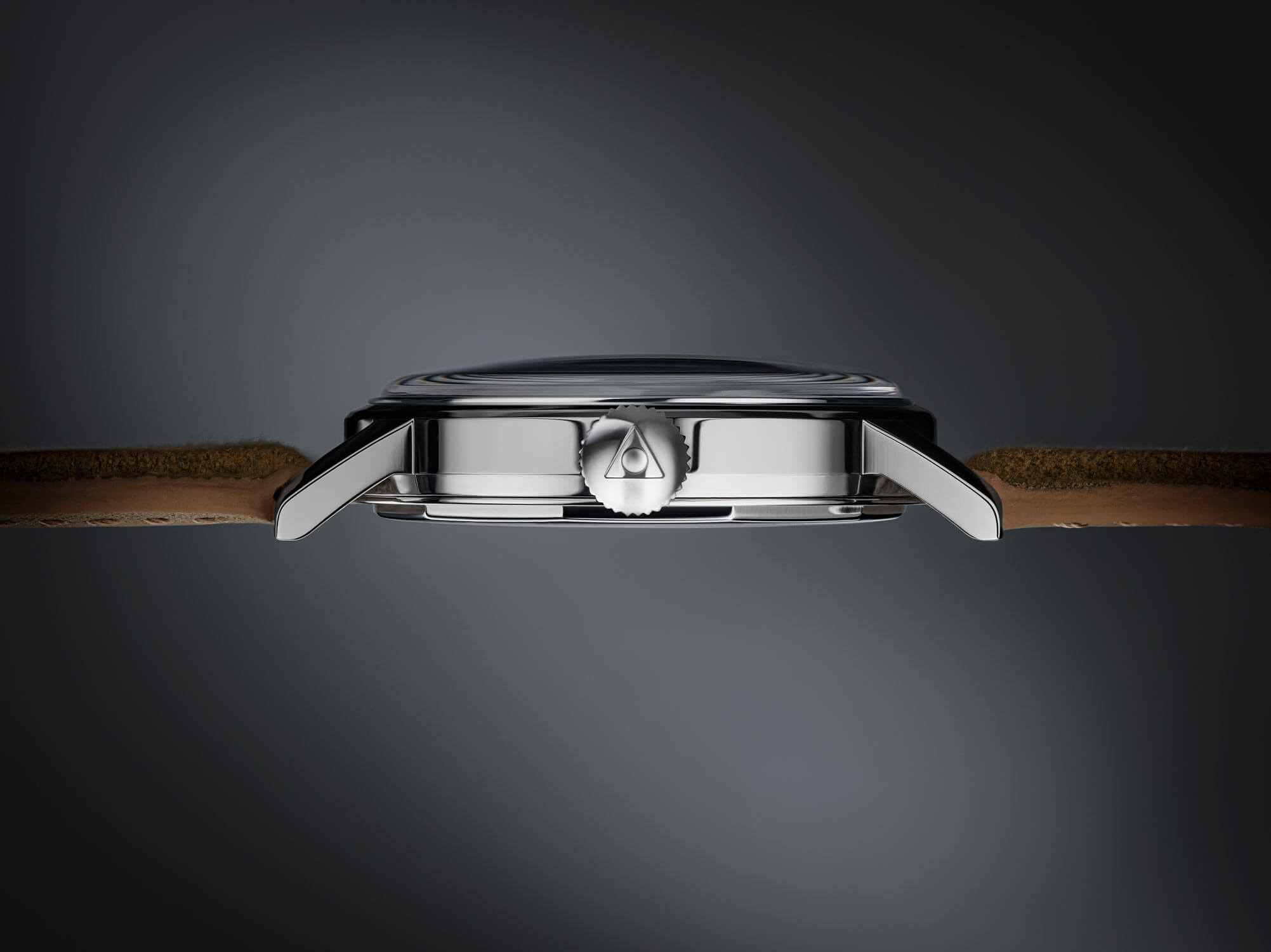 Matný černý ciferník s ručně leštěnými ručkami typu Dauphine v sobě spojuje klasickou krásu a funkčnost. Luminiscenční detaily v béžovém odstínu zajišťují čitelnost i za zhoršených světelných podmínek, zatímco proporce indexů přesně odpovídají rozvržení původního modelu. Ocelové pouzdro o průměru 34 mm vědomě odkazuje na estetičnost hodinářství minulých dekád – kompaktní, ale výrazné, s kombinací kartáčovaného a leštěného povrchu, které jemně zdůrazňuje tvar pouzdra. Model je osazen vypouklým safírovým sklíčkem, odolným proti poškrábání. Celek doplňuje béžový řemínek z Alcantary, měkký a příjemný na dotek, který celému modelu dodává pravý vintage charakter.