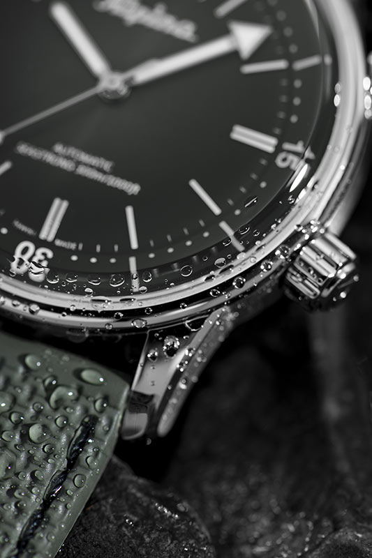 Tento zrcadlový efekt dále zvýrazňuje různé odstíny zelené a zároveň zlepšuje čitelnost hodinové a minutové ručky, což je základní rys hodinek každého divere. Alpina se postarala o tři velké ukazatele, aby zajistila, že Seastrong Diver 300 Heritage je funkční a skutečně užitečný v akci. Každá ze tří ruček je potažena luminiscenční látkou a minutová ručička je zakončena velkou šipkou směřující k indexům, které také svítí ve tmě, takže diveri nikdy nebudou muset hádat, jak dlouho byli ve vodě.