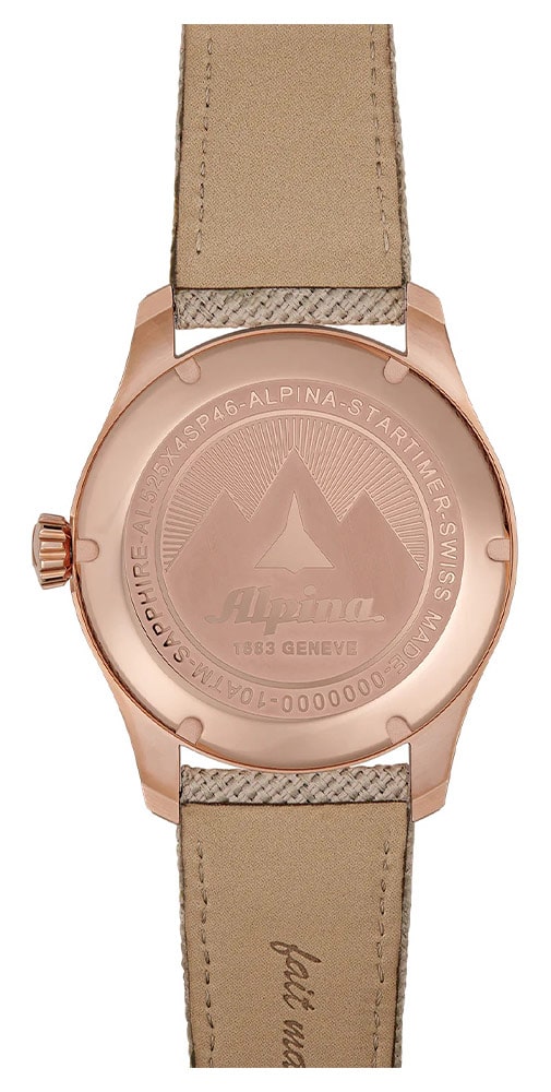 Známý trojúhelník Alpina je nastaven na 12 hodin a čelí 12hodinovému indexu, který má stejnou geometrii. Korunka, navržená i pro tento model, aby se vrátila k Originním aeronautickým stylům, je umístěna na 3. hodině a má „cibulový“ profil s jemnějším postojem. Šroubovaná zadní strana zaručuje dokonalou voděodolnost pouzdra při stropě 100 metrů. Na zadní straně můžete vidět tradiční rytinu, která je přítomna na všech hodinkách Startimer. Zobrazuje letadlo letící přes horu doprovázené starou verzí loga Alpina.