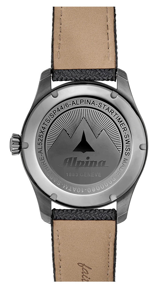 Známý trojúhelník Alpina je nastaven na 12 hodin a čelí 12hodinovému indexu, který má stejnou geometrii. Korunka, navržená i pro tento model, aby se vrátila k Originním aeronautickým stylům, je umístěna na 3. hodině a má „cibulový“ profil s jemnějším postojem. Šroubovaná zadní strana zaručuje dokonalou voděodolnost pouzdra u stropu cca 100 metrů. Na zadní straně můžete vidět tradiční rytinu, která je přítomna na všech hodinkách Startimer. Zobrazuje letadlo letící přes horu doprovázené starou verzí loga Alpina.