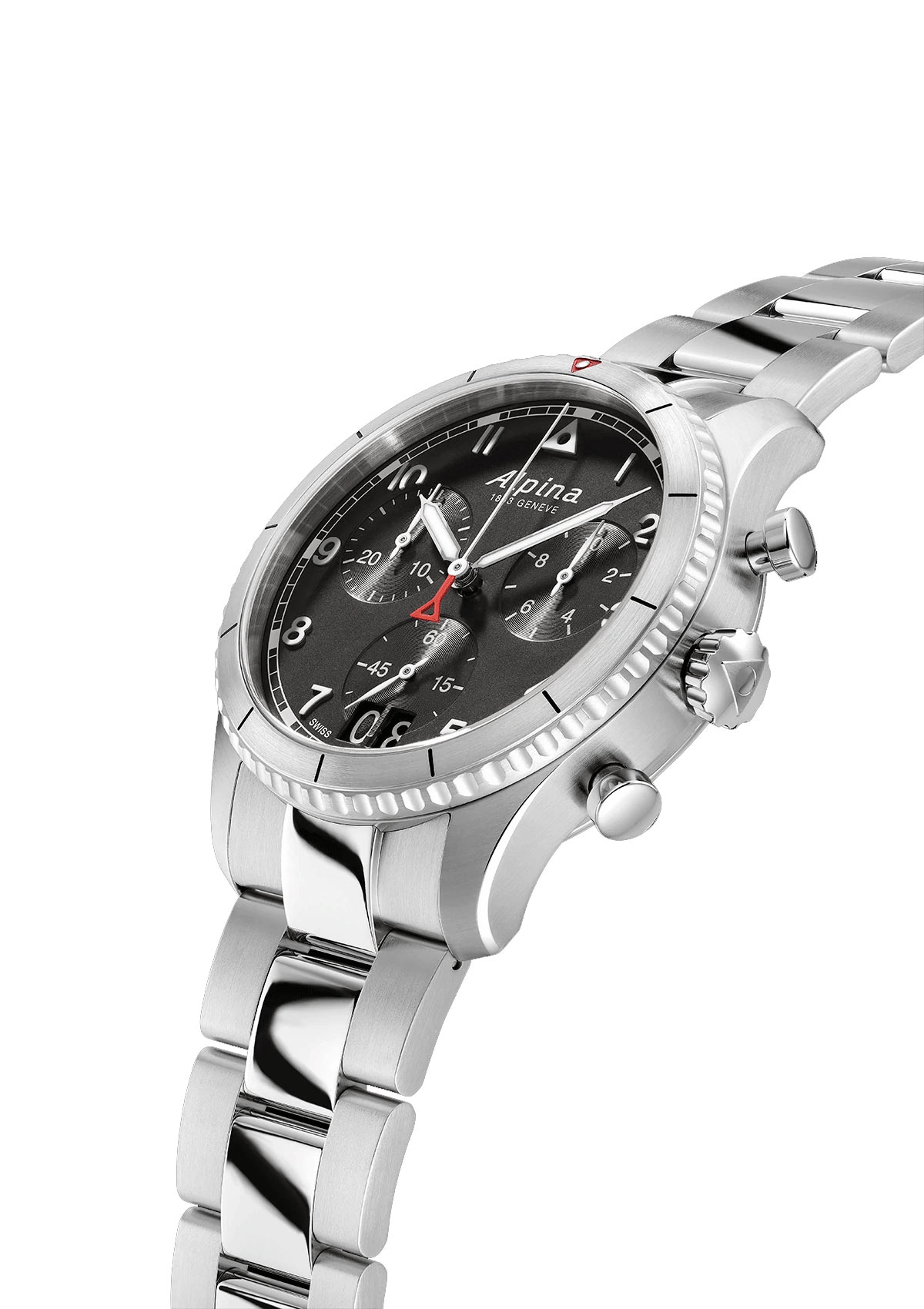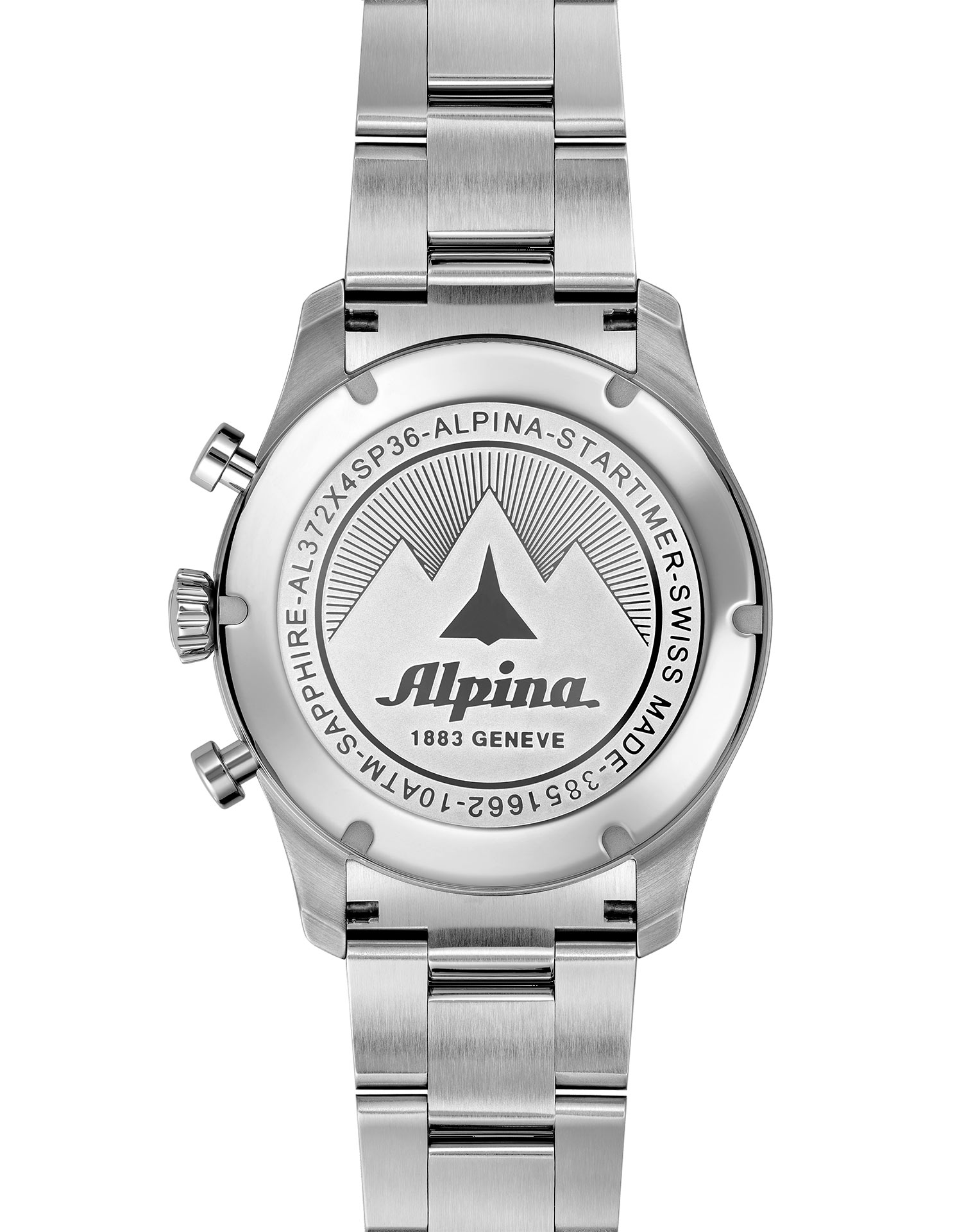 Pevné celonerezové hodinky s chronografem obsahují známý červený trojúhelník Alpina vyrytý na pozici 12 hodin a jsou otočeny k 12hodinovému indexu, který má stejnou geometrii. Korunka, navržená i pro tento model, aby se vrátila k Originním aeronautickým stylům, je umístěna na 3. hodině a má žlábkovaný „cibulový“ profil s jemnějším postojem. Šroubovaná zadní strana zaručuje dokonalou voděodolnost pouzdra u stropu cca 100 metrů. Na zadní straně můžete vidět tradiční rytinu, která je přítomna na všech hodinkách Startimer. Zobrazuje letadlo letící přes horu doprovázené starou verzí loga Alpina.
