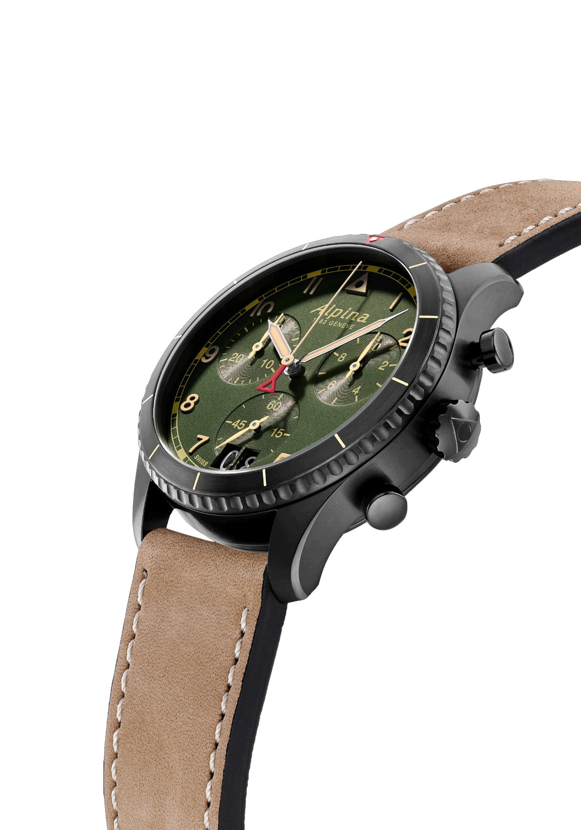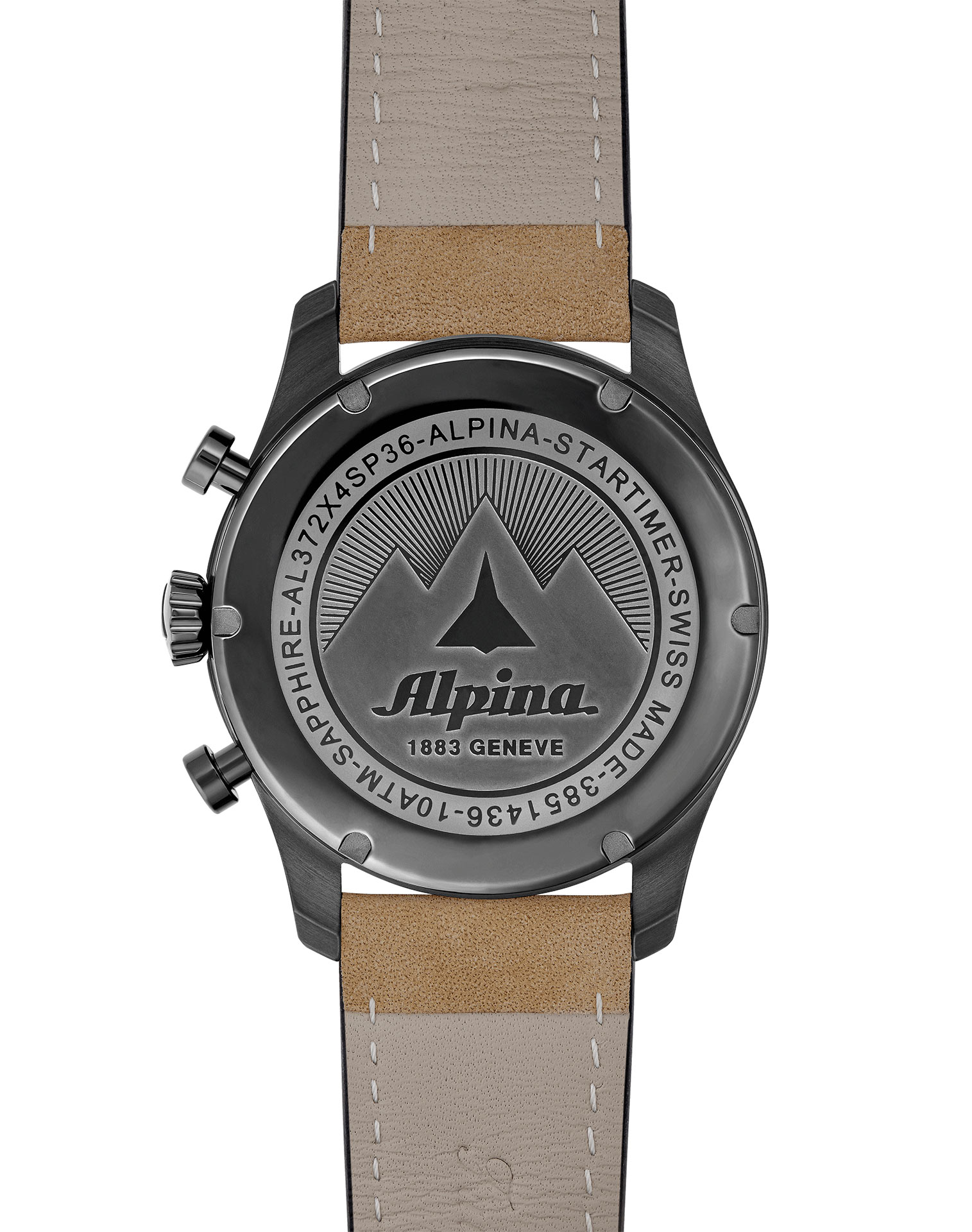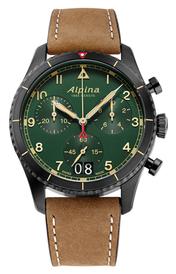 Hodinky s chronografem ve vintage stylu spojují olivově zelený ciferník s černým ocelovým pouzdrem s PVD povlakem připomínajícím vojenské khaki vlákno, které uchvátí milovníky bojovníků. Béžové ručičky a indexy, stejně jako luminiscenční materiál, odrážejí hnědý kožený řemínek z teletiny se šedobílým prošíváním s retro akcentem, v chromatické harmonii, která odráží smysl Alpiny pro detail. Známý červený trojúhelník Alpiny je vyrytý ve 12 hodin a směřuje k 12hodinovému indexu, který má stejnou geometrii. Korunka, navržená i pro tento model, aby se vrátila k Originním aeronautickým stylům, je umístěna na 3. hodině a má žlábkovaný „cibulový“ profil s jemnějším postojem. Šroubovaná zadní strana zaručuje dokonalou voděodolnost pouzdra u stropu cca 100 metrů. Na zadní straně můžete vidět tradiční rytinu, která je přítomna na všech hodinkách Startimer. Zobrazuje letadlo letící přes horu doprovázené starou verzí loga Alpina.