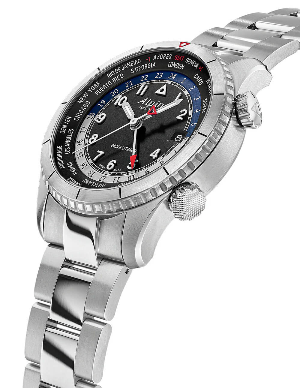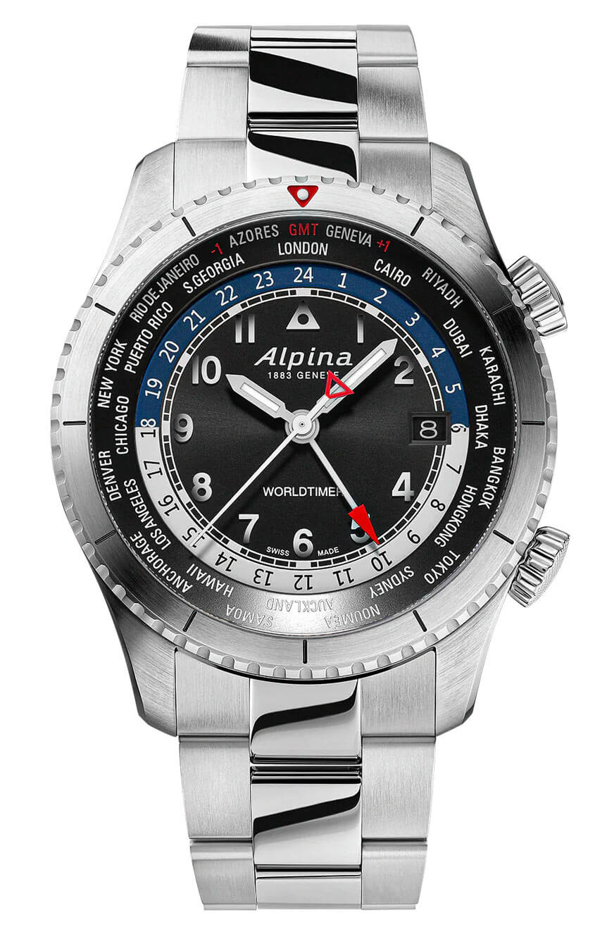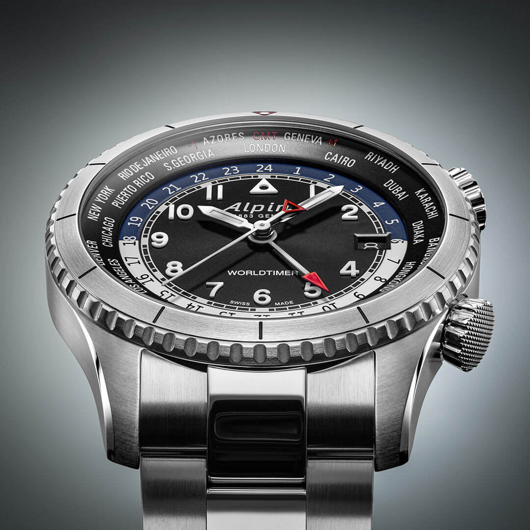 Černý ciferník časoměru Alpina Startimer Pilot Worldtimer je mistrovským dílem užitného designu. Je na něm umístěn kroužek se jmény měst reprezentujících různá časová pásma, což umožňuje rychlé zjištění času po celém světě. Dvě přídavné korunky, umístěné na pravé straně pouzdra, umožňují přesné nastavení škály časových pásem. Střední část ciferníku zdobí tradiční hodinová a minutová ručička a také přídavná ručička GMT s červeným hrotem, která ukazuje čas ve druhém časovém pásmu. Vysoká čitelnost ciferníku byla dosažena díky kontrastním detailům a dalším prvkům, jako je ukazatel dne a noci či datumovka umístěná na třetí hodině.