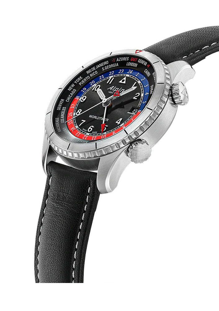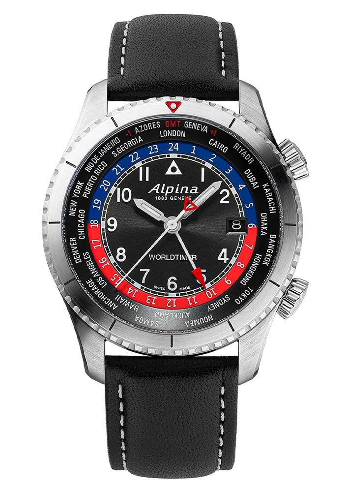 Pánské hodinky Alpina s časovými zónami na přední straně jsou chráněny konvexním safírovým sklíčkem vysoce odolným proti poškrábání. Pilotní hodinky Alpina Worldtimer jsou vybaveny strojkem švýcarského kalibru AL-255 s komplikací 24 časových pásem a datumovkou. Na tmavém ciferníku je stupnice s vybranými městy, která vám pomůže sledovat čas po celém světě. Aktuální domácí čas je indikován jasnými tradičními ručičkami, druhý pak dodatečnou ručičkou GMT s červenou šipkou na jejím vrcholu. Speciální přídavná korunka umístěná na pravé straně pouzdra umožňuje otáčet stupnicí časového pásma. Alpina Startimer Pilot Worldtimer je perfektním doplňkem pro každého cestovatele nebo nadšence dobrodružství. Číselník má dvoubarevný prstenec pro den a noc – je na něm překryta 24hodinová časová stupnice. Místo ve tři hodiny je vyhrazeno pro datumové okno s aktuálním dnem v měsíci. Celý design číselníku je extrémně propracovaným systémem indikace domácího času a času z různých míst po celém světě.