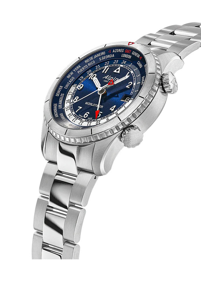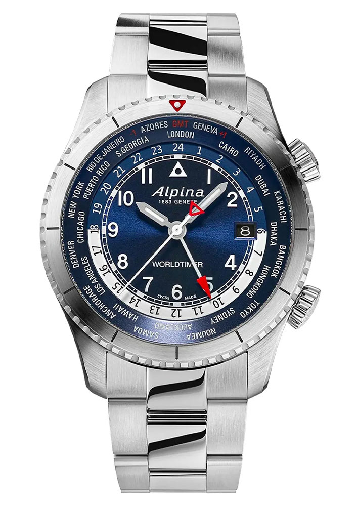 Pánské hodinky Alpina s časovými zónami na přední straně jsou chráněny konvexním safírovým sklíčkem vysoce odolným proti poškrábání. Pilotní hodinky Alpina Worldtimer jsou vybaveny strojkem švýcarského kalibru AL-255 s komplikací 24 časových pásem a datumovkou. Modrý ciferník má stupnici s vybranými městy, která vám pomůže sledovat čas po celém světě. Aktuální domácí čas je indikován jasnými tradičními ručičkami, druhý pak dodatečnou ručičkou GMT s červenou šipkou na jejím vrcholu. Speciální přídavná korunka umístěná na pravé straně pouzdra umožňuje otáčet stupnicí časového pásma. Alpina Startimer Pilot Worldtimer je perfektním doplňkem pro každého cestovatele nebo nadšence dobrodružství. Číselník má dvoubarevný prstenec pro den a noc – je na něm překryta 24hodinová časová stupnice. Místo ve tři hodiny je vyhrazeno pro datumové okno s aktuálním dnem v měsíci. Celý design číselníku je extrémně propracovaným systémem indikace domácího času a času z různých míst po celém světě.