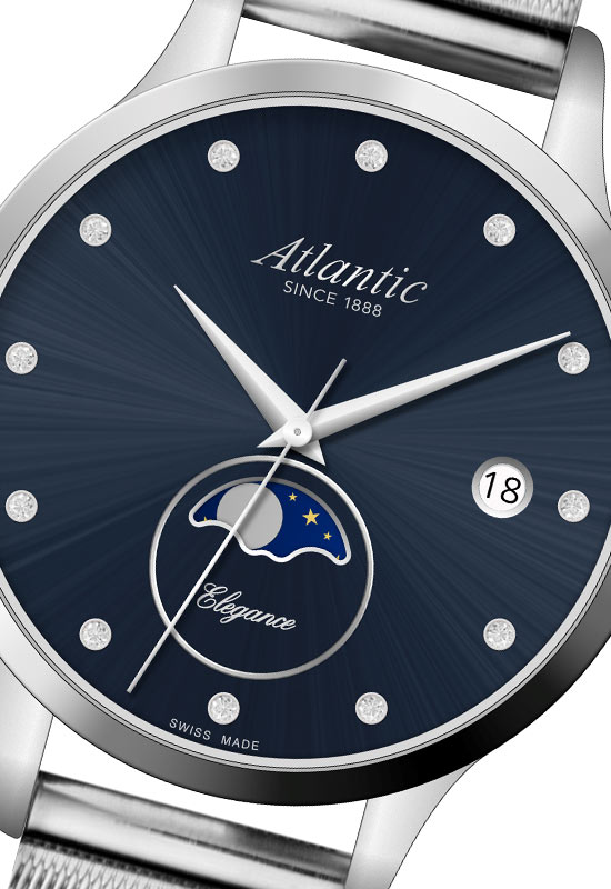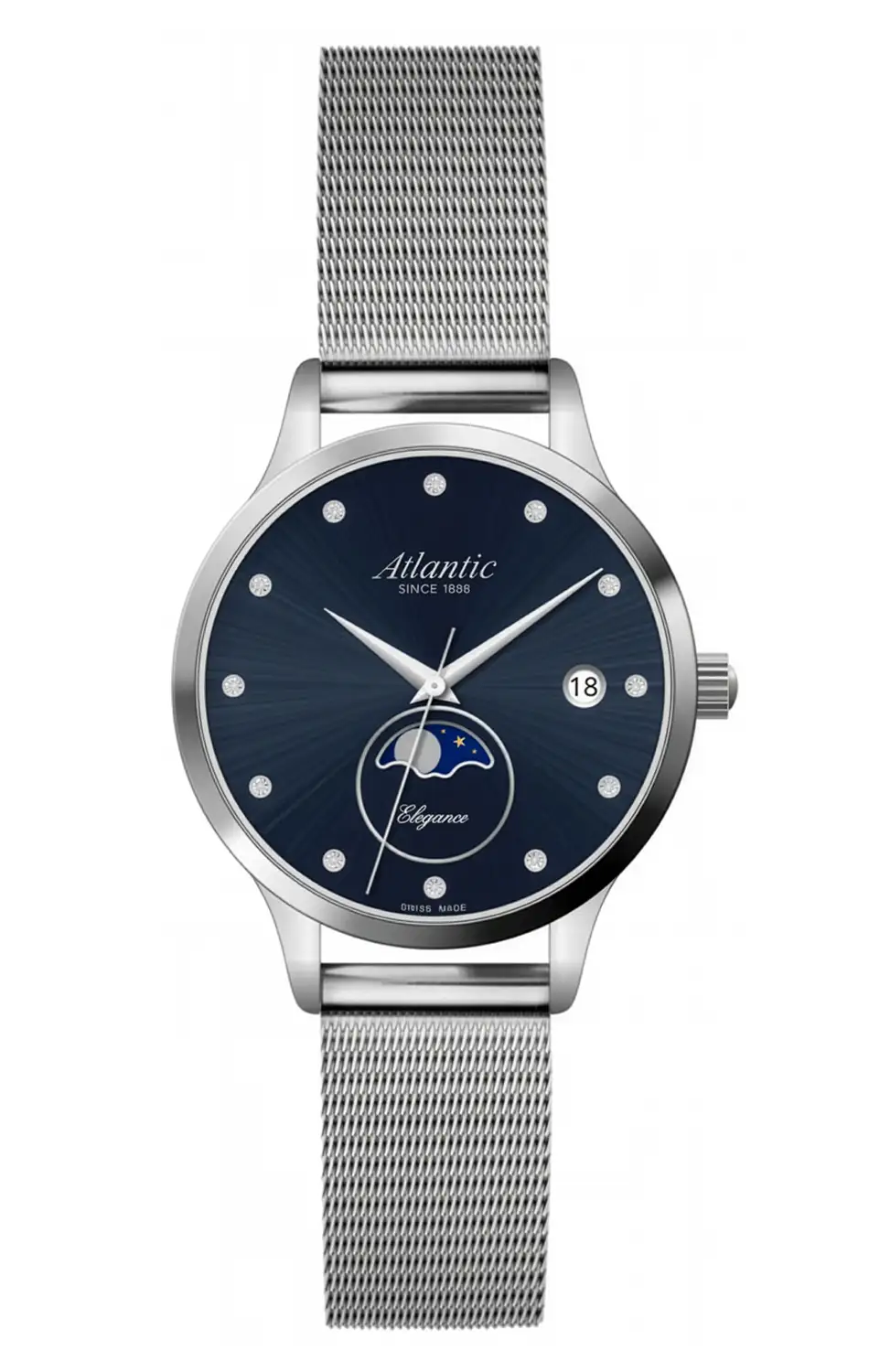 Dámské hodinky Atlantic Elegance 29040.41.57MB . Model hodinek se safírovým sklem a krásným síťovaným náramkem. Módní design odkazující na skandinávský styl. Doplňkové funkce, jako jsou fáze měsíce a diskrétní zobrazení data v elegantním rámu, zdůrazňují praktickou stránku. Švýcarská výroba potvrzená swiss made podpisem se zdá být perfektní kombinací pro ženy, které chtějí zdůraznit svůj individualismus a vášeň pro krásu. Označení hodin v podobě svítících broušených krystalů vzbuzuje zvěDavosat, nesměle přitahuje pozornost. Dostupná cena a nadčasový, ale moderní styl staví tyto hodinky do popředí modelů pro každý den a příležitost.