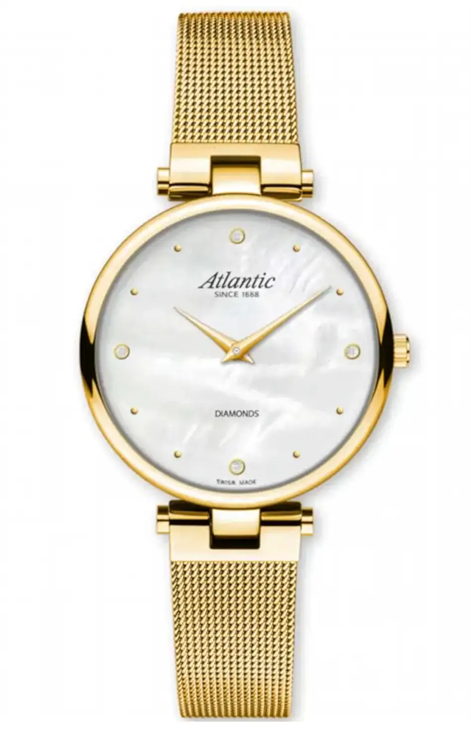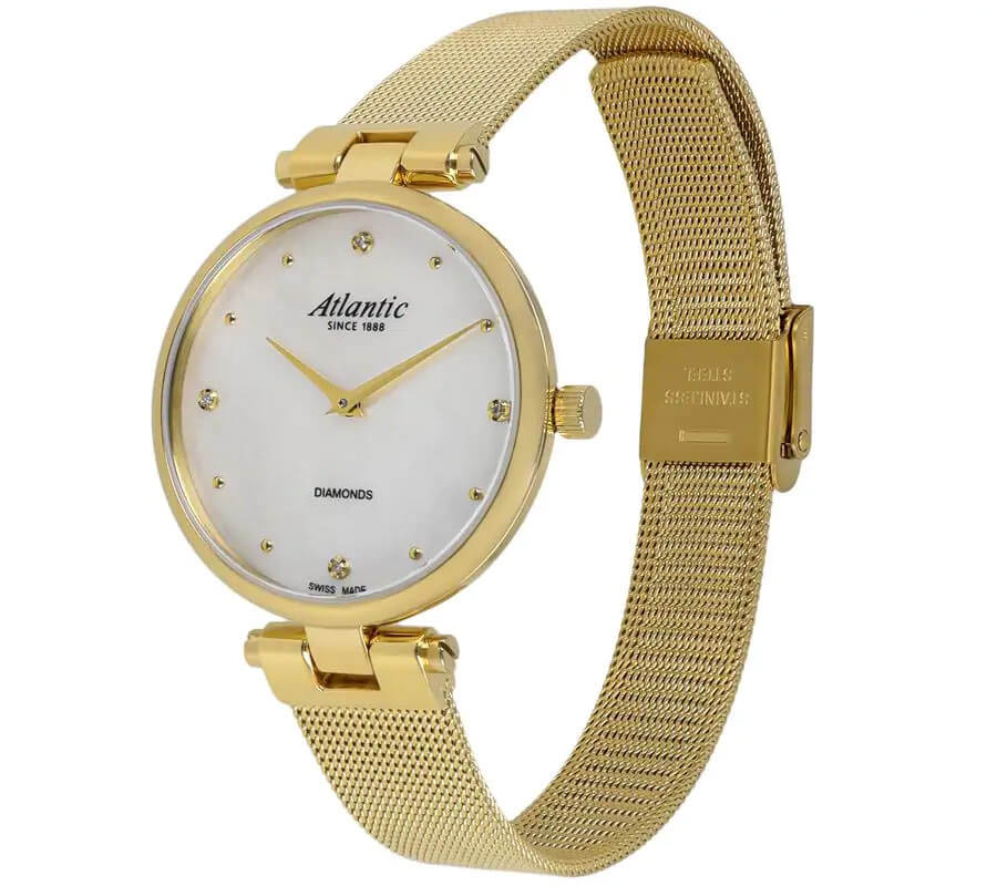 Perleťový ciferník okouzluje jemnou hrou barev a organickým odleskem typickým pro přírodní materiál. Čtyři pravé diamanty nahrazují klasické indexy a dodávají celku lesk a výjimečnost. Uvnitř pouzdra pracuje švýcarský quartzový strojek Ronda – záruka spolehlivosti a přesného chodu. Pozlacené dámské hodinky Atlantic 29044.45.07GMB na náramku nejsou jen měřičem času – jsou promyšlenou kompozicí tvaru, světla a detailu, která se stane osobním vyjádřením stylu každé elegantní ženy.