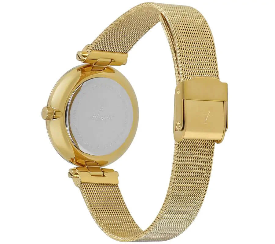 Pozlacené pouzdro o průměru 33 mm je vyrobeno z vysoce kvalitní nerezové oceli a perfektně ladí s jemným náramkem typu mesh. Milánské pletení se krásně přizpůsobuje zápěstí a zároveň dodává celku lehkost a eleganci. Celek uzavírá safírové sklíčko s jemným vypouklým profilem, které jemně odráží světlo a podtrhuje ženský charakter designu.