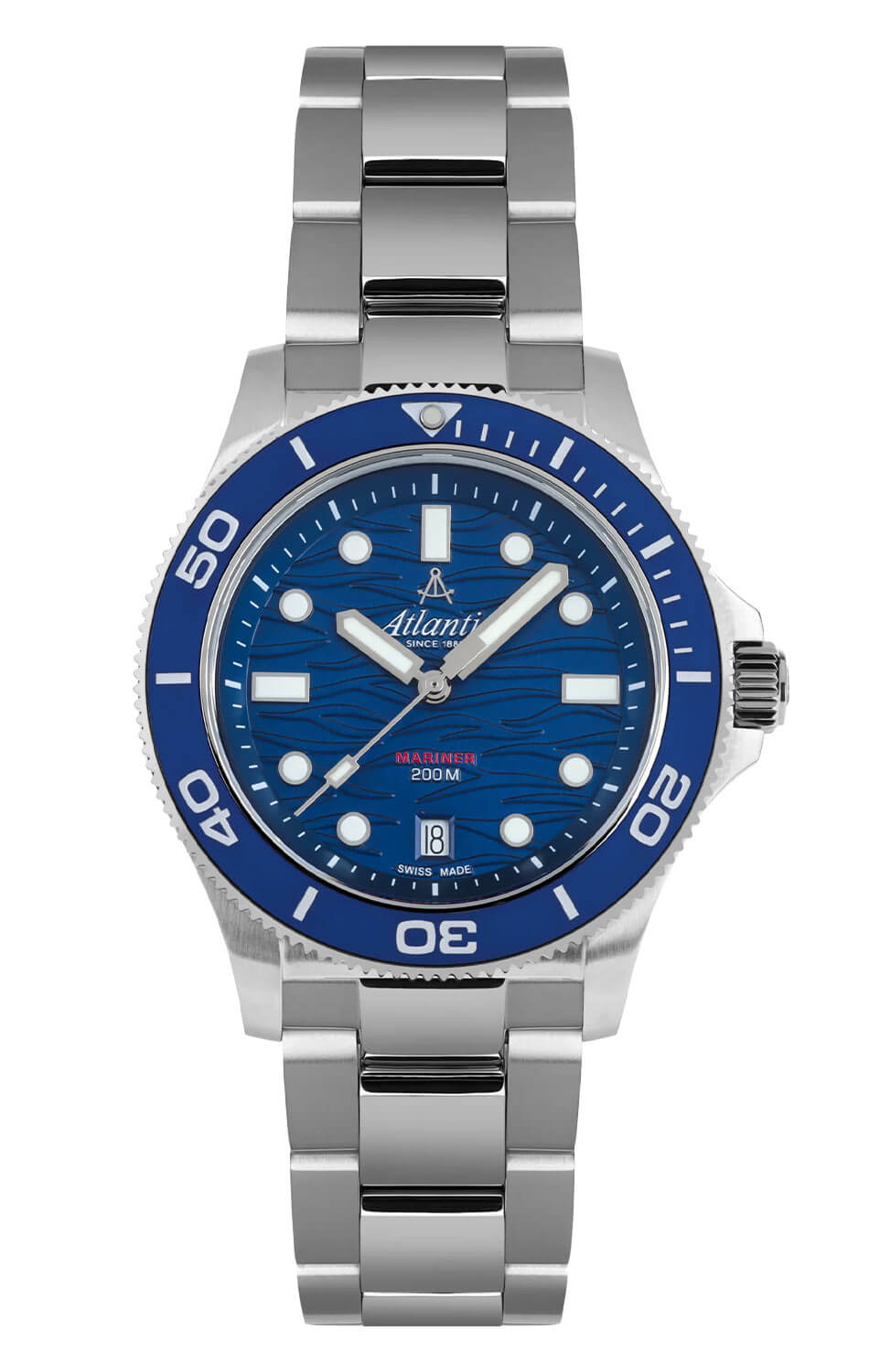 To, co model Atlantic Mariner odlišuje od jiných diverů, je ciferník – hluboce modrý, ozdobený jemným vlnkovým vzorem, který evokuje klidné, ale neproniknutelné vody moří a oceánů. Indexy a ručky jsou opatřeny luminiscenční vrstvou pro čitelnost ve tmě a datumovka na šesté hodině nenápadně dotváří vyváženou kompozici. Jsou to hodinky pro ty, kteří se nebojí hloubky – ať už té ve vodě, nebo v detailech. Hodinky Atlantic 81376.41.59 na náramku jsou skvělým doplňkem pro moderního sportovce – tento model drží krok se svým majitelem za všech podmínek.
