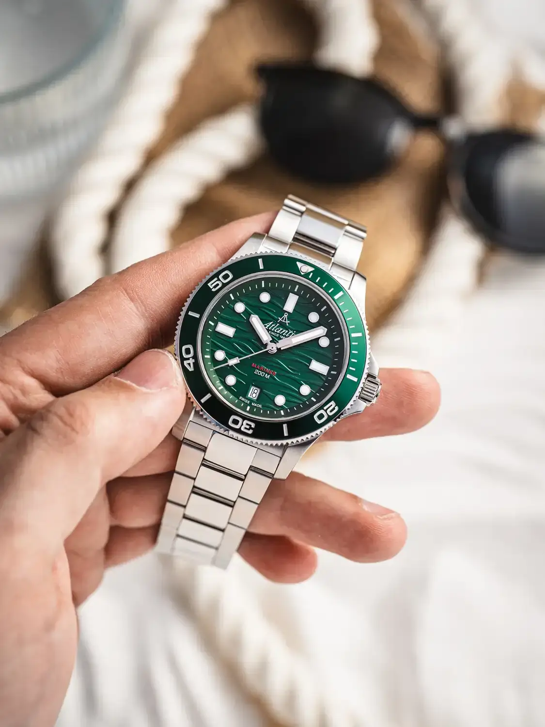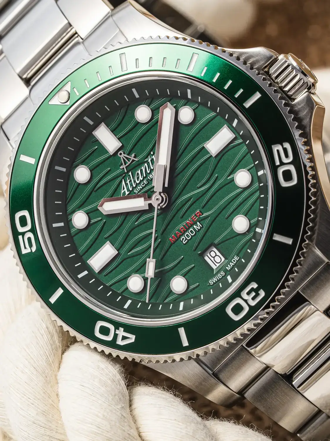 To, co model Atlantic Mariner odlišuje od jiných diverů, je ciferník – hluboce zelený, ozdobený jemným vlnkovým vzorem, který evokuje klidné, ale neproniknutelné vody moří a oceánů. Indexy a ručky jsou opatřeny luminiscenční vrstvou pro čitelnost ve tmě a datumovka na šesté hodině nenápadně dotváří vyváženou kompozici. Jsou to hodinky pro ty, kteří se nebojí hloubky – ať už té ve vodě, nebo v detailech. Hodinky Atlantic 81376.41.79 na náramku jsou skvělým doplňkem pro moderního sportovce – tento model drží krok se svým majitelem za všech podmínek.