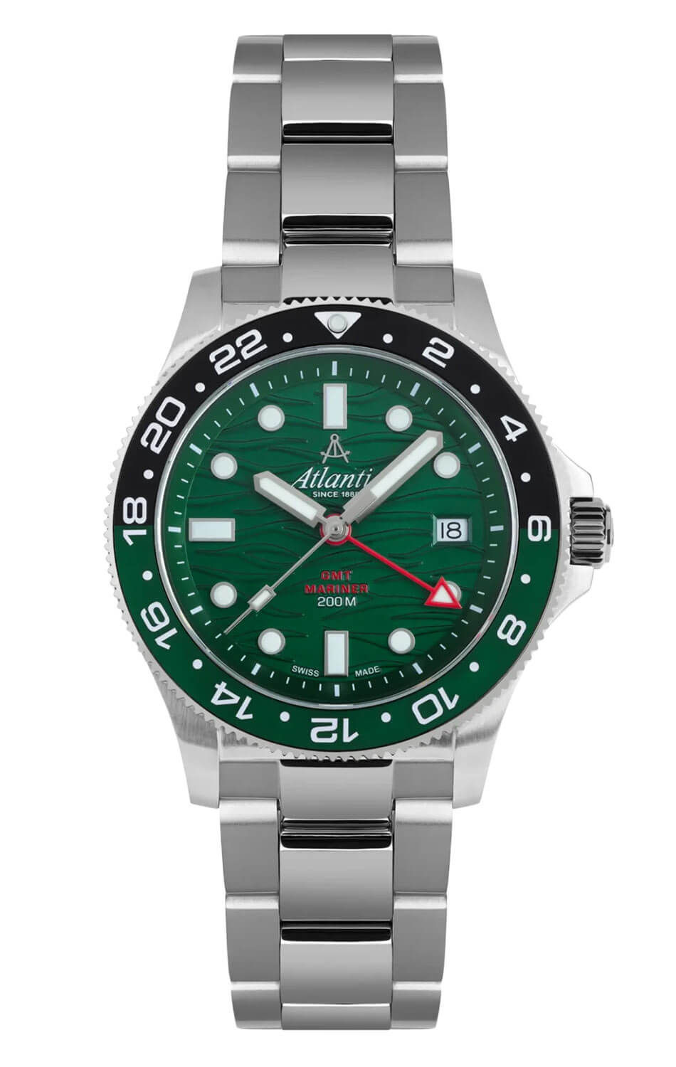 Tím, co odlišuje Atlantic Mariner od ostatních potápěčských modelů, je číselník – sytě zelený, zdobený jemným vlnkovým vzorem, který evokuje klidné, ale neproniknutelné vody moří a oceánů. Indexy a ručky jsou opatřeny luminiscenční vrstvou pro čitelnost ve tmě, zatímco datumovka na šesté hodině decentně zapadá do kompozice. Jsou to hodinky pro ty, kdo se nebojí hloubky – ať už té vodní, nebo té v detailech. Hodinky Atlantic 81576.41.79GMT s druhým časovým pásmem na náramku jsou výborným doplňkem pro moderního sportovce – model, který udrží krok se svým majitelem za každých okolností.