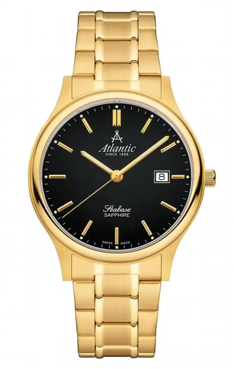 Pozlacené pánské hodinky Atlantic Seabase 60348.45.61 jsou elegantní model s klasickými liniemi, vybavený pouzdrem o průměru 40 mm — velikost ideální jak pro štíhlá, tak střední zápěstí. Celá konstrukce, včetně masivního náramku, byla vyrobena z vysoce kvalitní ušlechtilé oceli 316L, pokryté vrstvou PVD v odstínu žlutého zlata. Hluboká čerň číselníku ve spojení se zlatými indexy a ručkami dodává modelu elegantní, ale moderní charakter.