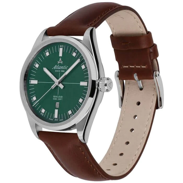 Robustní pouzdro o průměru 40.5 mm, vyrobené z nerezové oceli s jemným kartáčovaným povrchem, dodává hodinkám eleganci a podtrhuje jejich odolnost. Švýcarské pánské hodinky Atlantic 733614171 se vyznačují vysokou vodotěsností — až do 100 metrů, což je činí odolnými vůči dešti, většímu postříkání i náhodnému kontaktu s vodou — perfektně se hodí jak do kanceláře, tak pro aktivní odpočinek. Atlantic Seacloud je vybaven černým koženým řemínkem, který dokonale doplňuje jejich klasický vzhled. Tento řemínek není jen elegantní, ale také velmi pohodlný – měkká kůže se skvěle přizpůsobí zápěstí a zajišťuje pohodlné nošení po celý den, bez ohledu na příležitost.