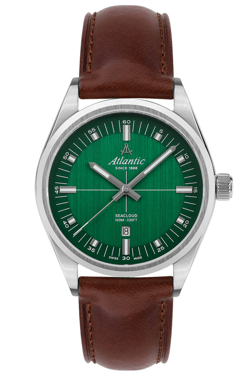 Pod odolným safírovým sklem, které je rezistentní proti poškrábání, se nachází elegantní zelený ciferník, na kterém jemně září indexy a zřetelné ručičky vyplněné svítící luminiscencí. Tento kontrastní design nejen dodává hodinkám sofistikovaný vzhled, ale také zajišťuje výbornou čitelnost za jakýchkoli podmínek. Praktické okénko datového ukazatele na šesté hodině je velmi užitečné a umožňuje snadno sledovat aktuální den a lépe plánovat každodenní povinnosti. Klasické hodinky Atlantic Seacloud 73361.41.71 pohání spolehlivý, přesný švýcarský strojek Ronda, který zaručuje výjimečnou přesnost – vlastnost, kterou značka Atlantic již mnoho let proslula.
