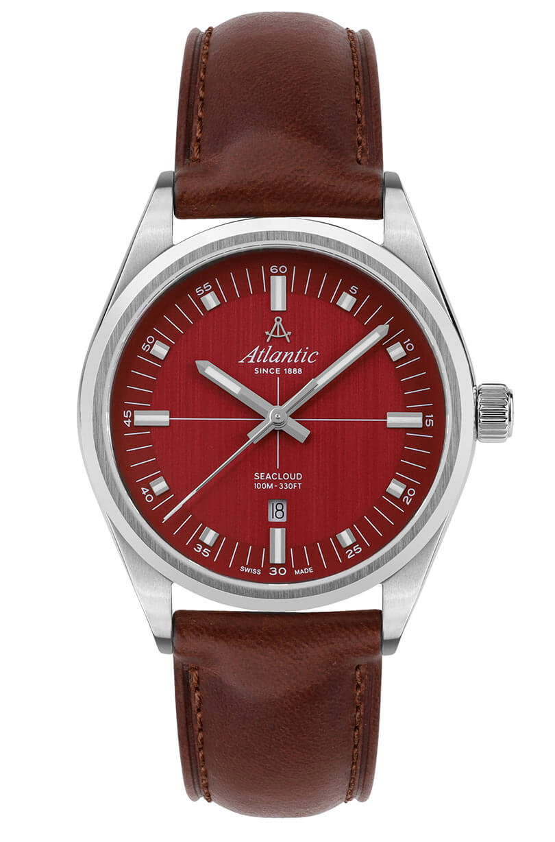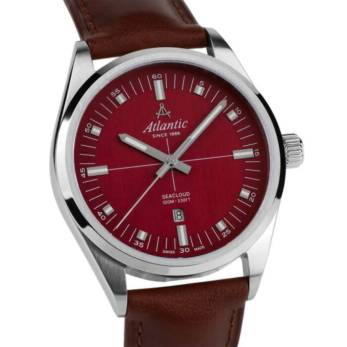 Pod odolným safírovým sklem, které je rezistentní proti poškrábání, se nachází elegantní červený ciferník, na kterém jemně září indexy a zřetelné ručičky vyplněné svítící luminiscencí. Tento kontrastní design nejen dodává hodinkám sofistikovaný vzhled, ale také zajišťuje výbornou čitelnost za jakýchkoli podmínek. Praktické okénko datového ukazatele na šesté hodině je velmi užitečné a umožňuje snadno sledovat aktuální den a lépe plánovat každodenní povinnosti. Klasické hodinky Atlantic Seacloud 73361.41.91 pohání spolehlivý, přesný švýcarský strojek Ronda, který zaručuje výjimečnou přesnost – vlastnost, kterou značka Atlantic již mnoho let proslula.