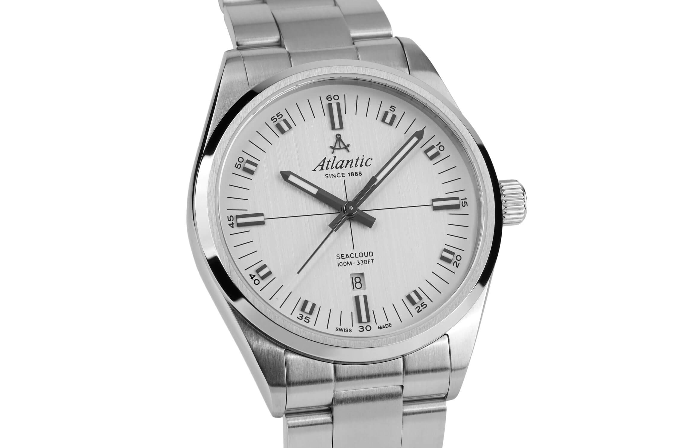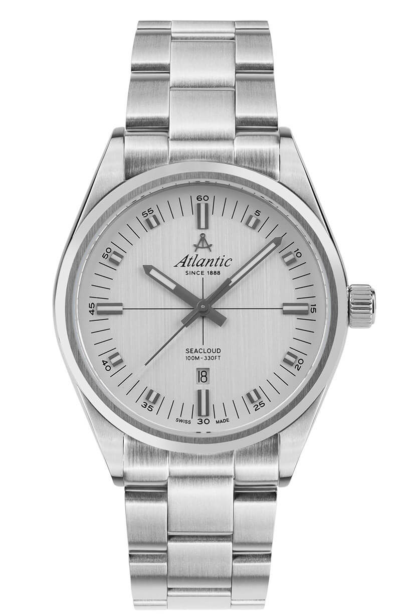Robustní pouzdro o průměru 40.5 mm, vyrobené z nerezové oceli s jemným kartáčovaným povrchem, dodává hodinkám eleganci a podtrhuje jejich odolnost. Švýcarské pánské hodinky Atlantic 733664121 se vyznačují vysokou vodotěsností — až do 100 metrů, což je činí odolnými vůči dešti, většímu postříkání i náhodnému kontaktu s vodou — perfektně se hodí jak do kanceláře, tak pro aktivní odpočinek. Atlantic Seacloud je vybaven ocelovým náramkem, který dokonale doplňuje jejich klasický vzhled. Ocelový pásek není jen elegantní, ale také velmi pohodlný – motýlková spona zajišťuje bezpečné a pohodlné nošení po celý den.