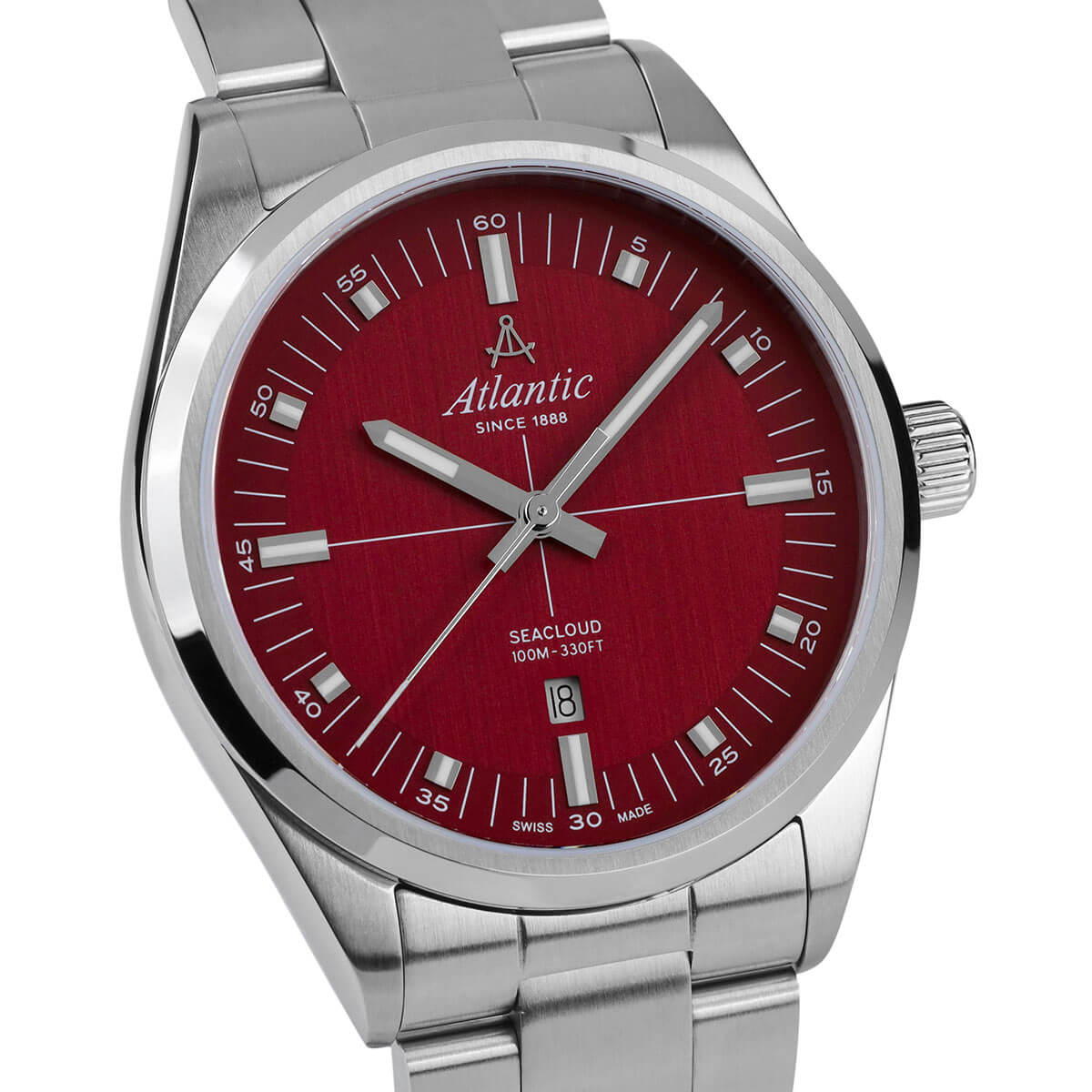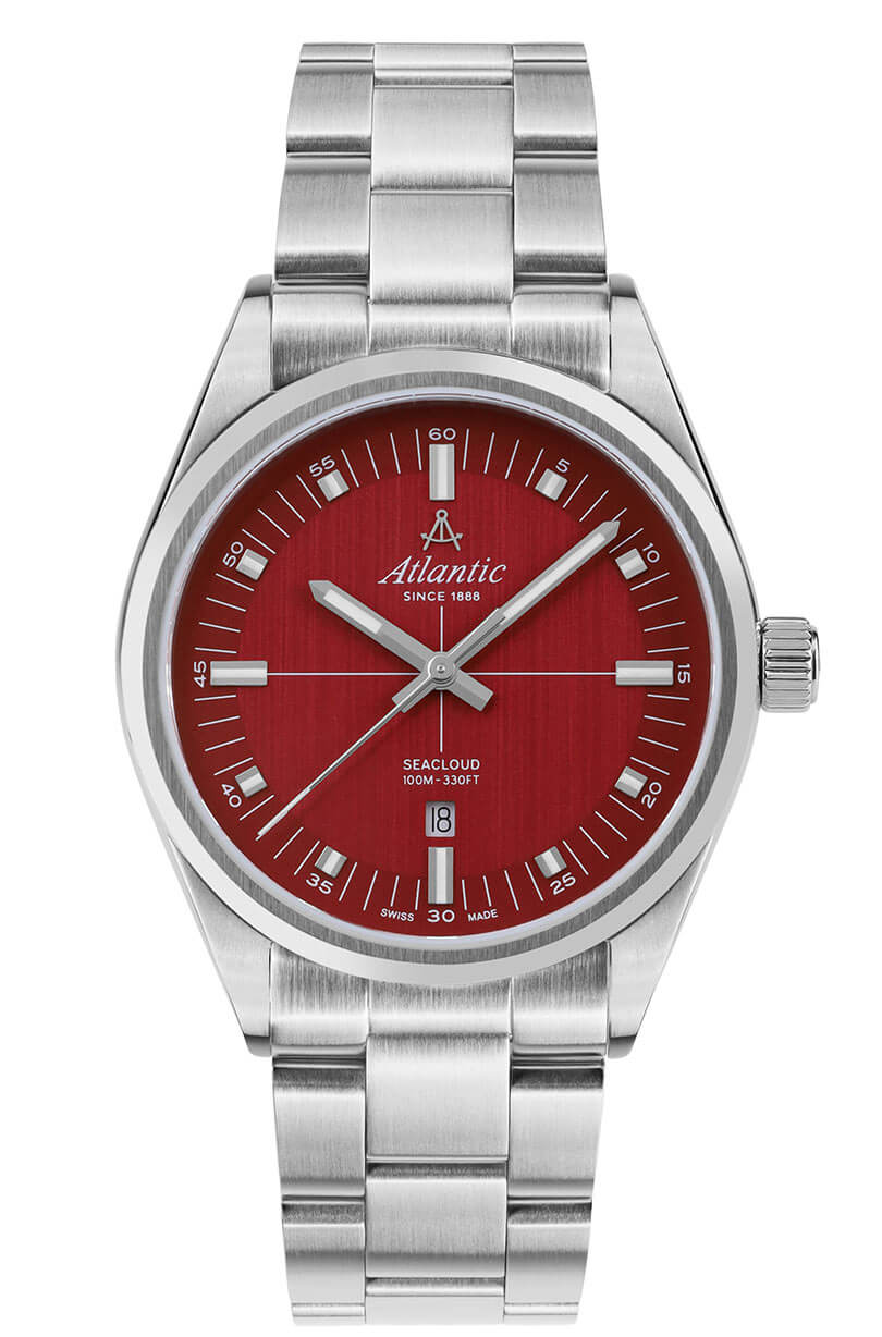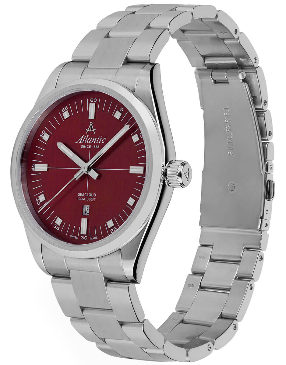 Pod odolným safírovým sklem, které je rezistentní proti poškrábání, se nachází elegantní červený ciferník, na kterém jemně září indexy a zřetelné ručičky vyplněné svítící luminiscencí. Tento kontrastní design nejen dodává hodinkám sofistikovaný vzhled, ale také zajišťuje výbornou čitelnost za jakýchkoli podmínek. Praktické okénko datového ukazatele na šesté hodině je velmi užitečné a umožňuje snadno sledovat aktuální den a lépe plánovat každodenní povinnosti. Klasické hodinky Atlantic Seacloud 73366.41.91 na náramku pohání spolehlivý, přesný švýcarský strojek Ronda, který zaručuje výjimečnou přesnost – vlastnost, kterou značka Atlantic již mnoho let proslula.