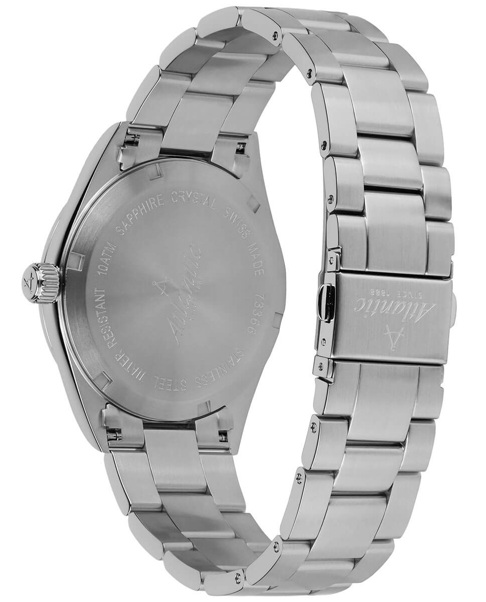 Robustní pouzdro o průměru 40.5 mm, vyrobené z nerezové oceli s jemným kartáčovaným povrchem, dodává hodinkám eleganci a podtrhuje jejich odolnost. Švýcarské pánské hodinky Atlantic 733664191 se vyznačují vysokou vodotěsností — až do 100 metrů, což je činí odolnými vůči dešti, většímu postříkání i náhodnému kontaktu s vodou — perfektně se hodí jak do kanceláře, tak pro aktivní odpočinek. Atlantic Seacloud je vybaven ocelovým náramkem, který dokonale doplňuje jejich klasický vzhled. Ocelový pásek není jen elegantní, ale také velmi pohodlný – motýlková spona zajišťuje bezpečné a pohodlné nošení po celý den.