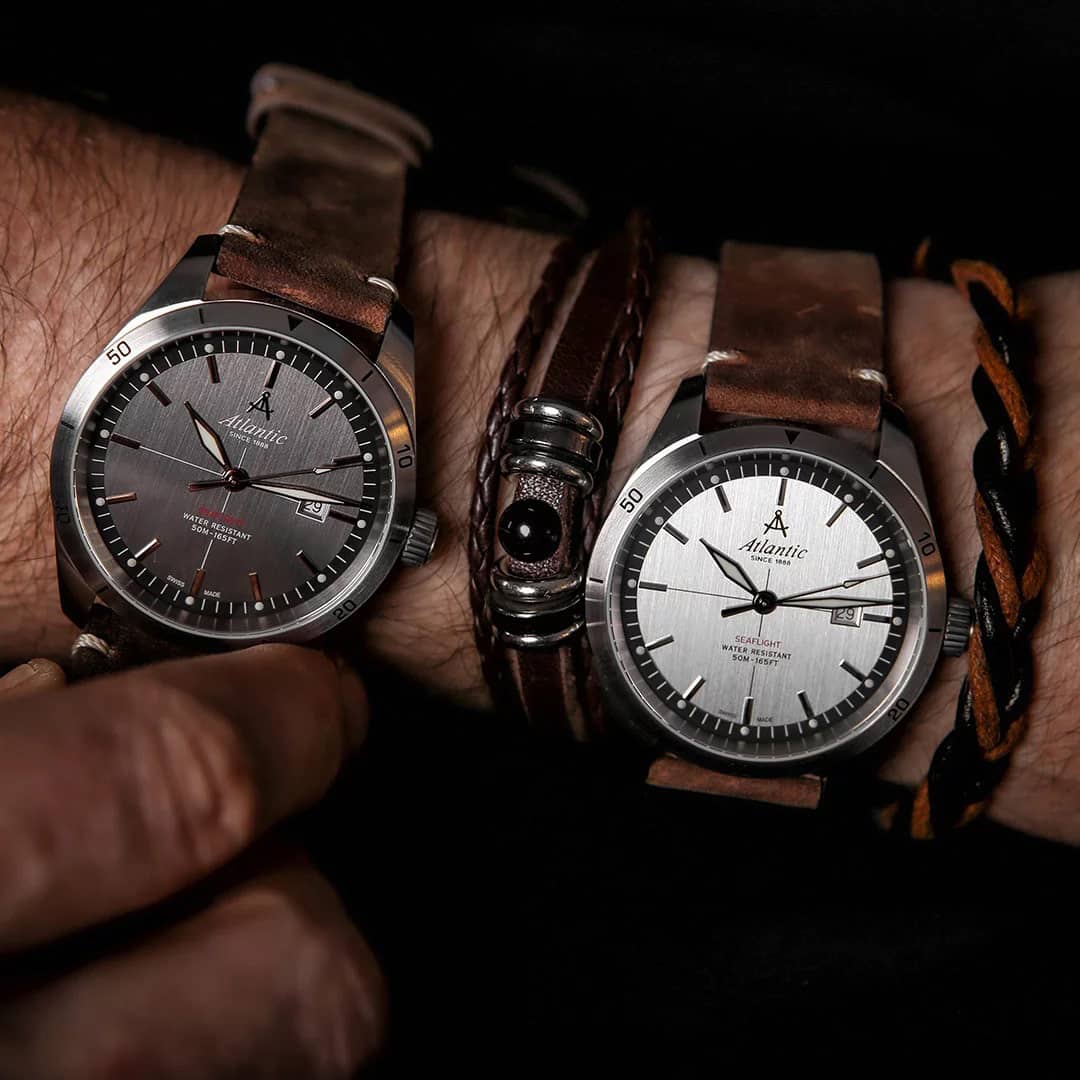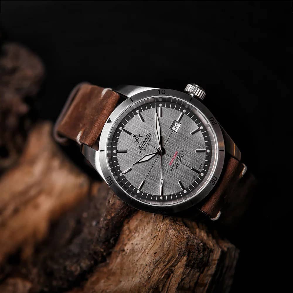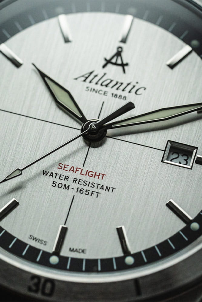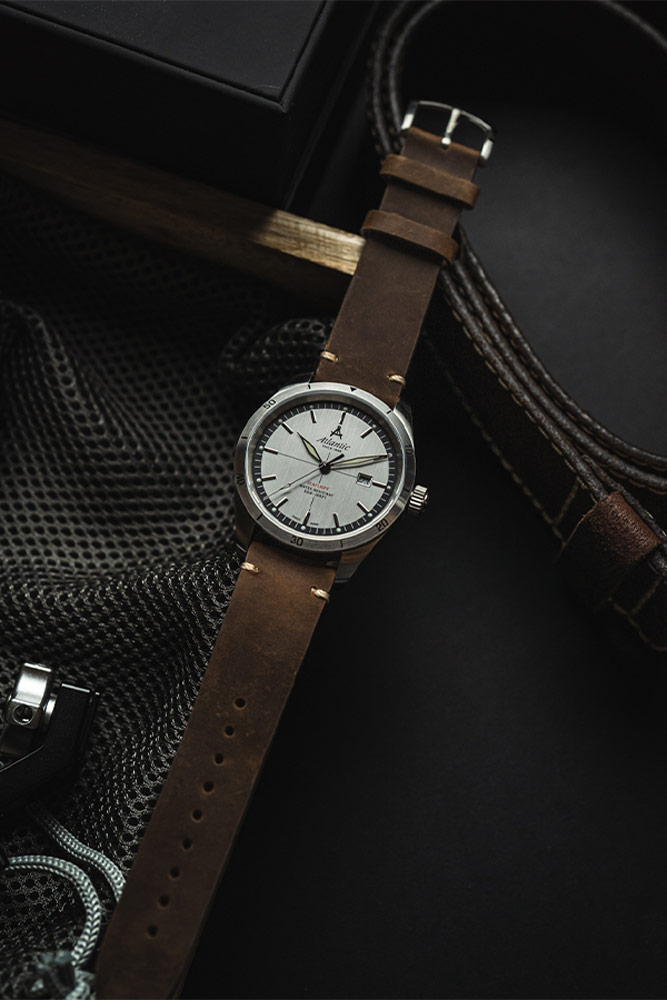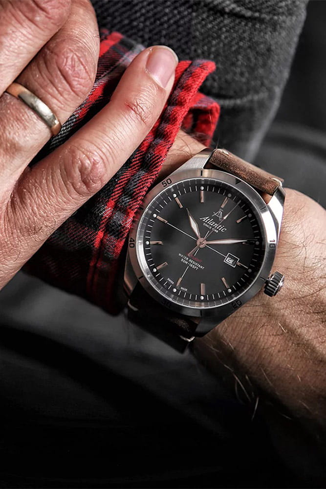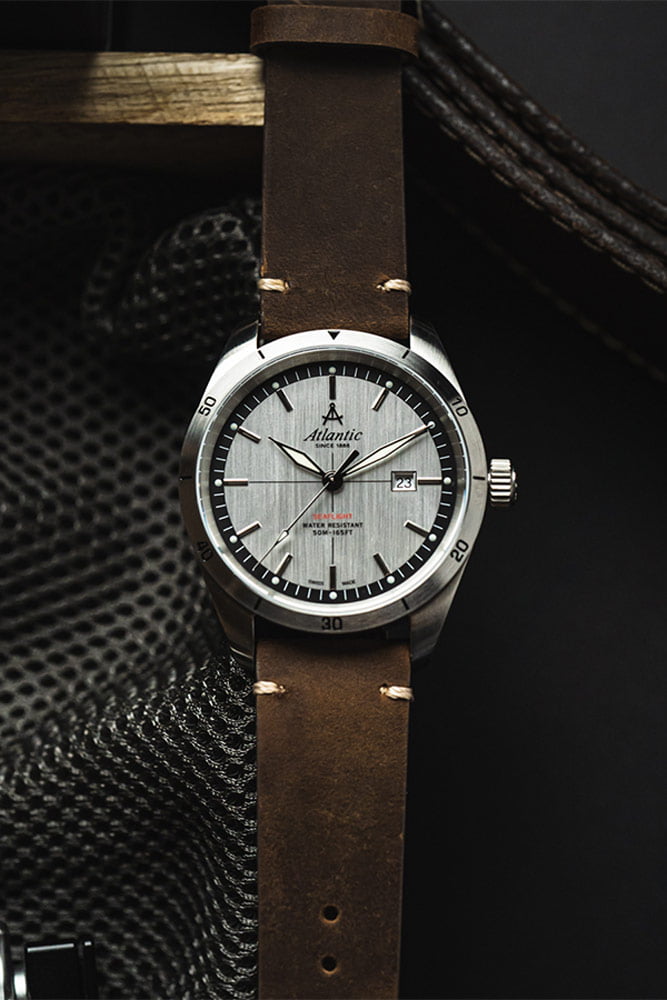 Pánské hodinky Atlantic Seaflight 70351.41.21 . Švýcarská interpretace „pilotního“ modelu uznávaného výrobce v oblasti klasických hodinek. Masivní 44mm pouzdro ukrývá ciferník z broušené oceli s datumovkou a pilotní hodinovou, minutovou a vteřinovou ručkou. Kolem ciferníku je umístěn černý kroužek s minutovou stupnicí, který dodává kontrastní, dynamický vzhled. Model na koženém řemínku se speciálním prošíváním ve stylu vintage viditelným zvenčí.