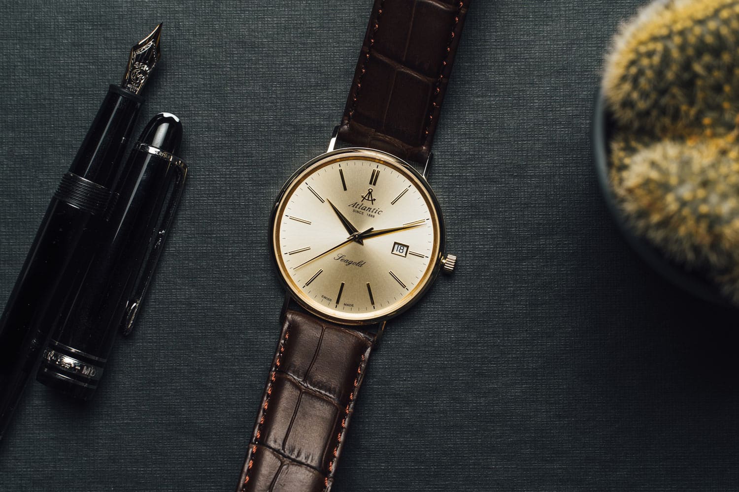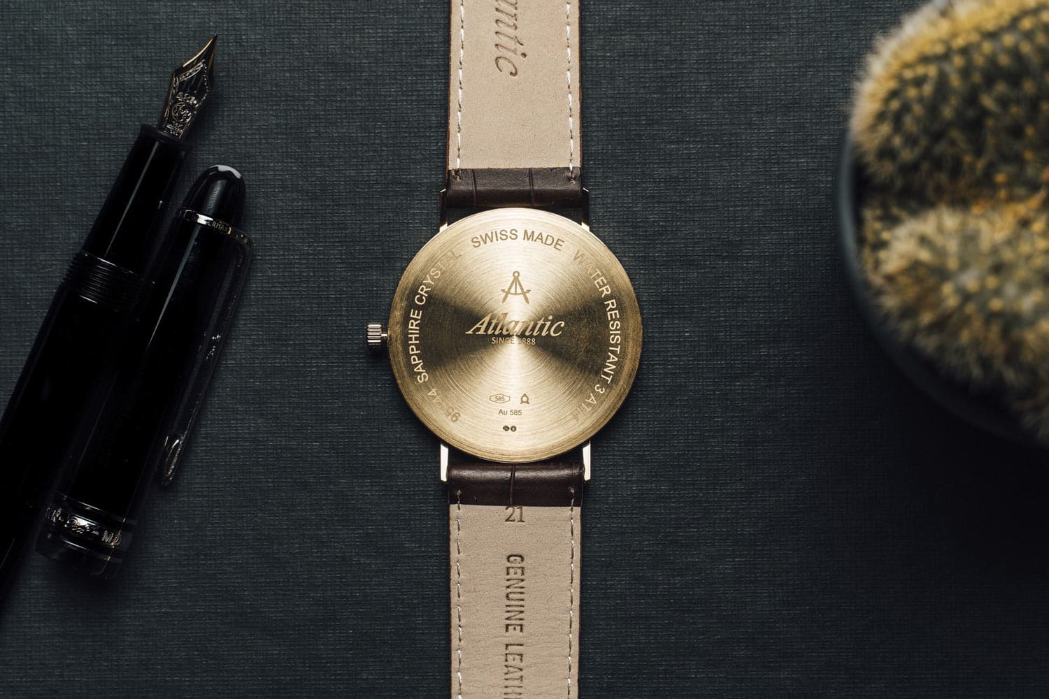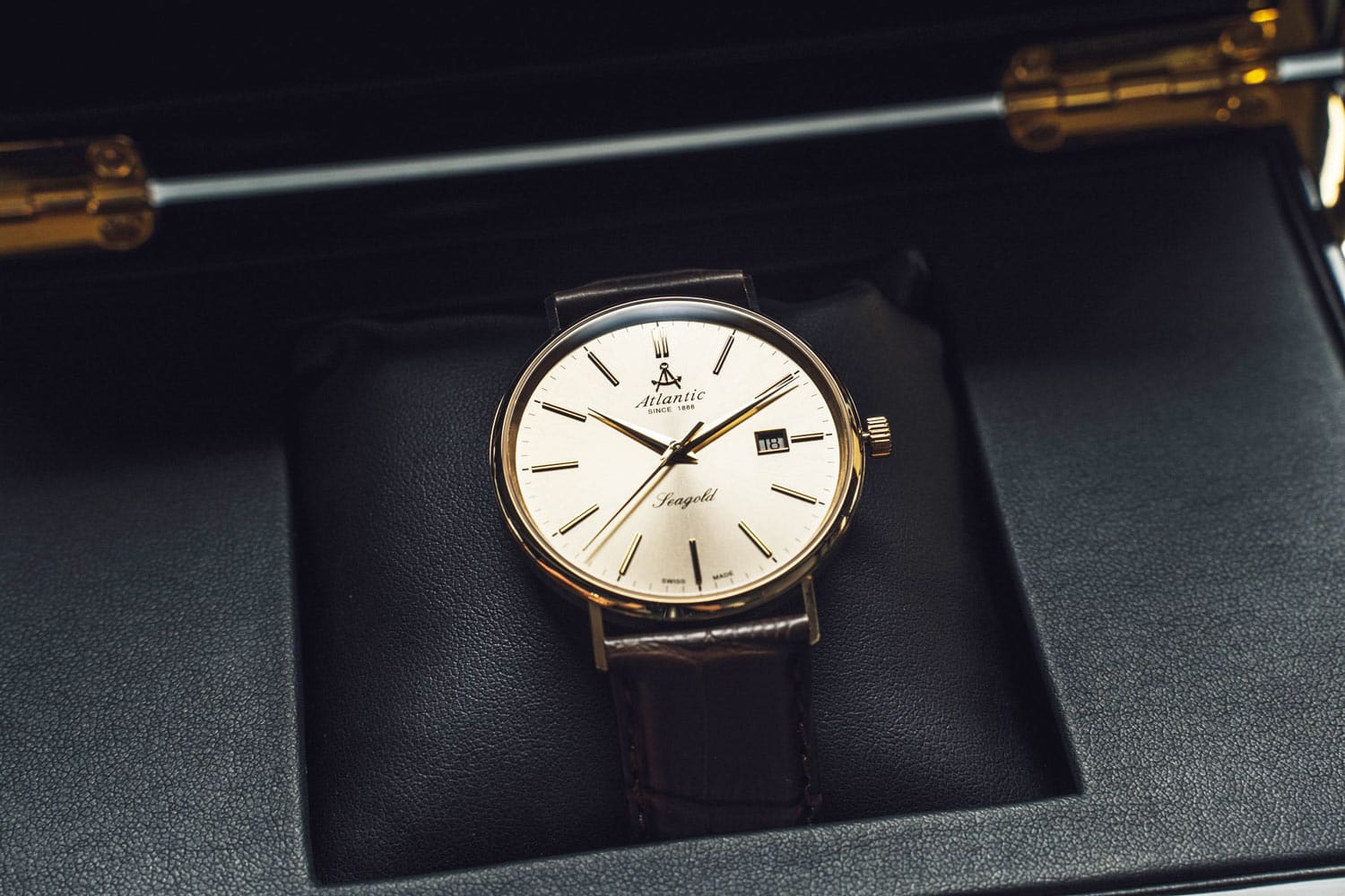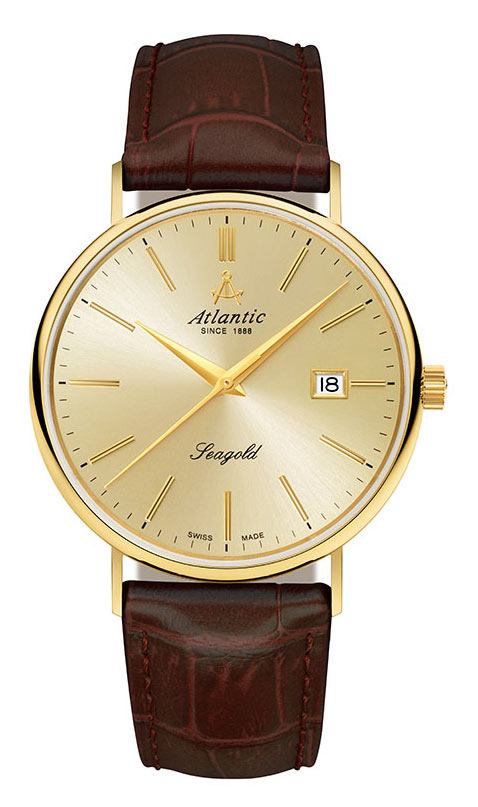Na přední straně hodinek je umístěno safírové sklo, které je mimořádně odolné proti poškrábání. Toto sklo pokrývá minimalistický, ale elegantní ciferník ve zlaté barvě. Na něm jsou umístěny štíhlé ručičky a tenké indexy ve tvaru čárek. Na pozici třetí hodiny se nachází okno s datumovkou. Čtvercové okno se světlým pozadím ukazuje aktuální den v měsíci. Na pozici dvanácté hodiny se nachází hrdé logo značky Atlantic se známým symbolem v podobě lodního kompasu. Na pozici šesté hodiny je zdobný nápis kolekce Seagold. Pod ciferníkem je instalován švýcarský mechanismus ETA, swiss made, který s vysokou přesností pohání ručičky a datumovku.